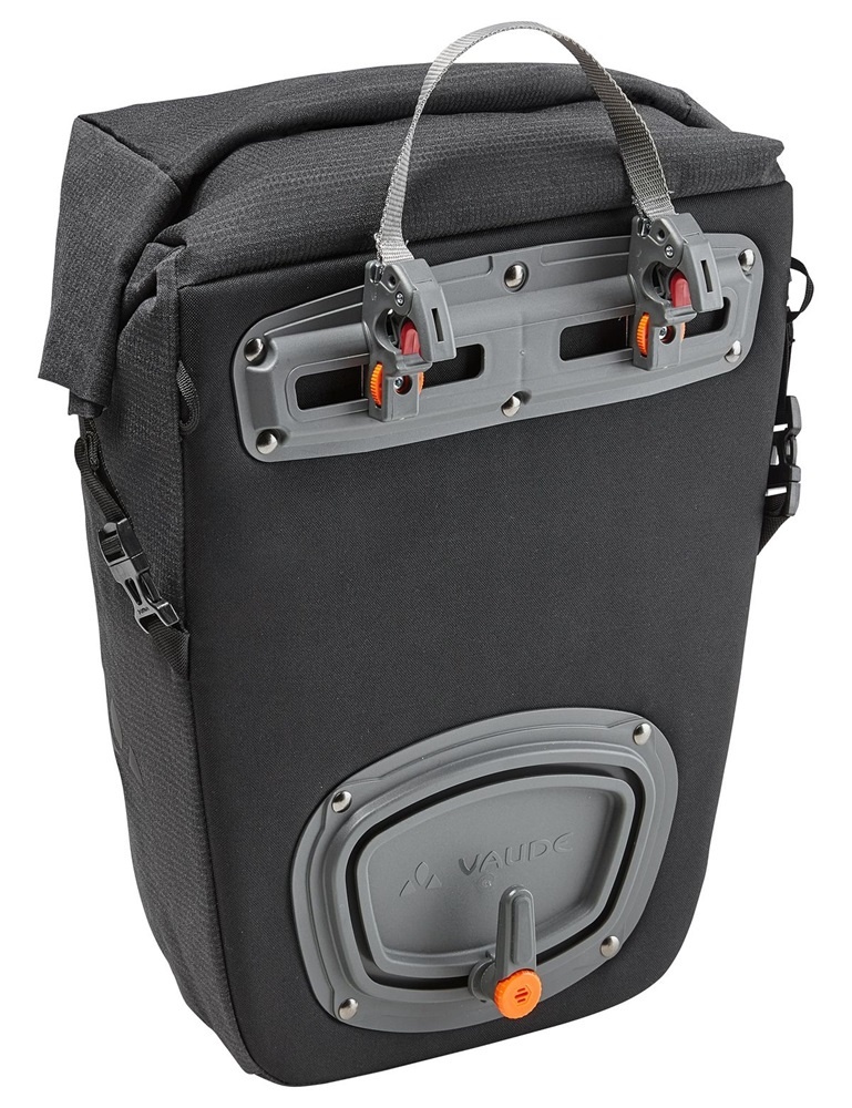 Het unieke Quick Mount Release (QMR)-systeem van Vaude zorgt ervoor dat het afnemen van de tas in één beweging gebeurt. Even trekken aan het handvatkoord dat gekoppeld is aan het kliksysteem en beide haken klikken soepel los van de bagagedragerbuis. Deze haken zijn in de breedte te verschuiven via twee railtjes in combinatie met makkelijk te bedienen handwieltjes. De haken passen standaard op dragerbuizen van 8 tot 16 millimeter. Het geheel bevindt zich op een soft-back achterplaat. Onderaan de achterplaat zit nóg een flexibel te verstellen haak, voor een extra stevige bevestiging aan de fiets.