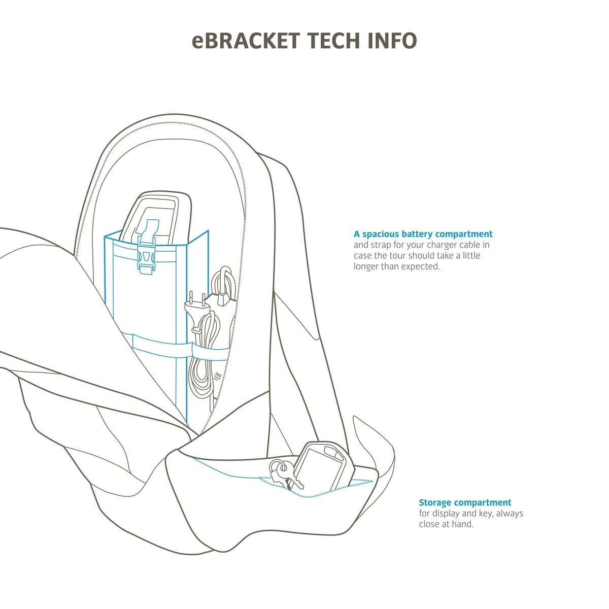 - de eBracket 14 heeft een apart vak voor een tweede accu én voor een oplader, speciaal voor bij het afleggen van extra lange afstanden