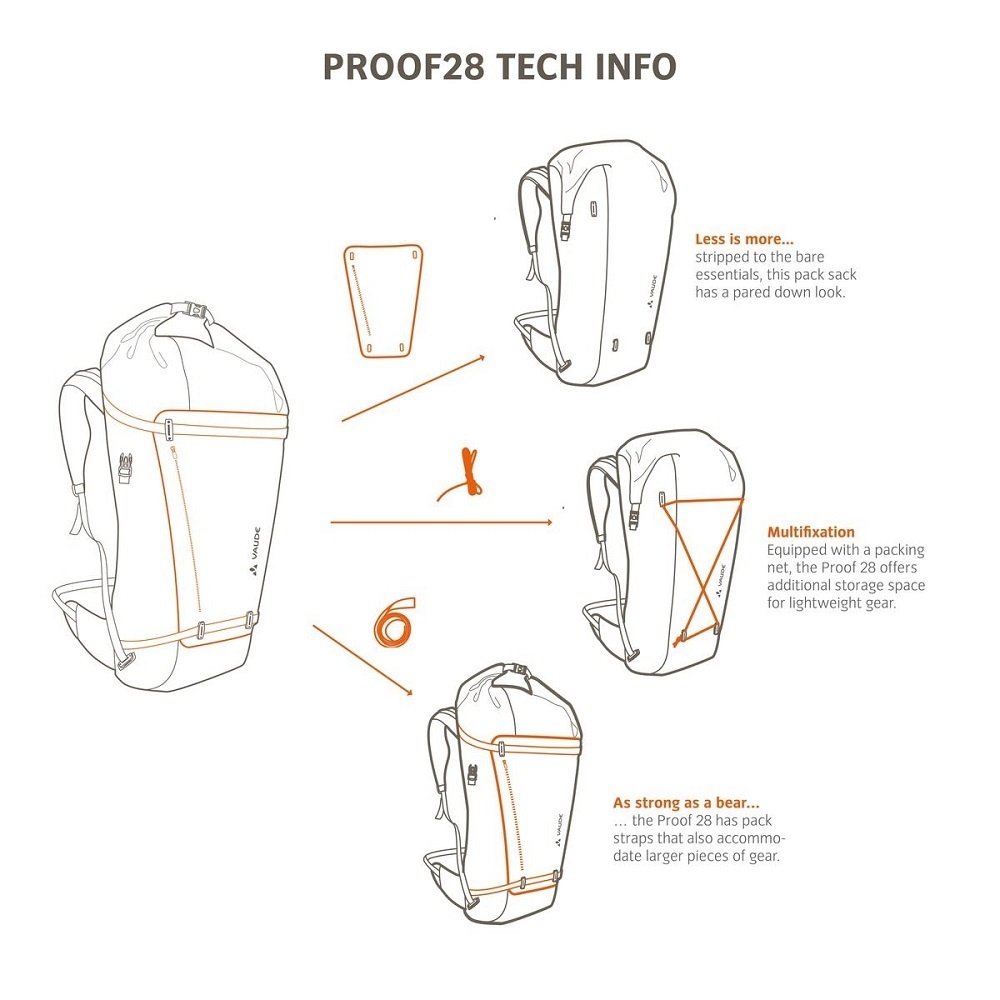 De Proof 28 is volledig waterdicht. Daarvoor zorgen niet alleen de gelaste naden en het robuuste materiaal, maar ook de rolsluiting. Deze is wat hoger en lager af te sluiten, waarbij een flexibele maar stevige strook kunststof gemakkelijke houvast biedt. Naast de rolsluiting, sluit u de tas met twee klikgespen.