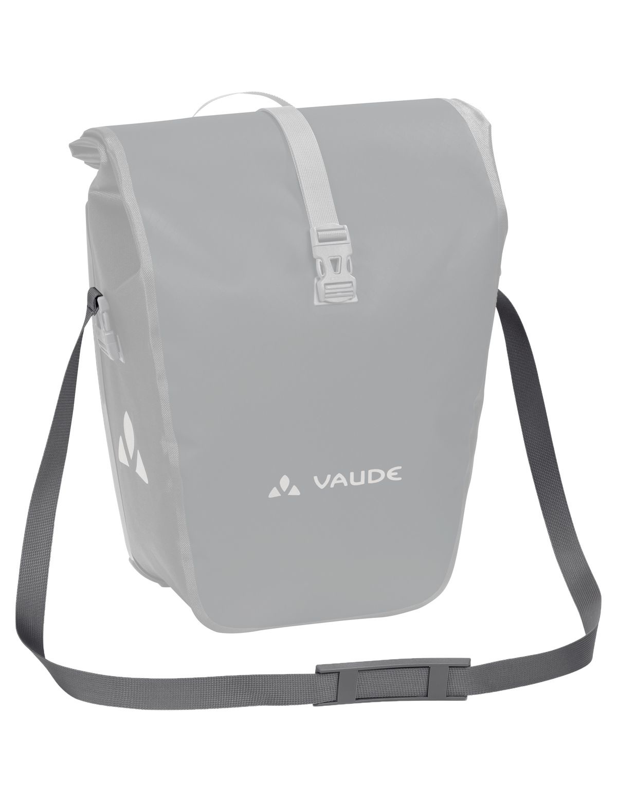 Een donkergrijze schouderband voor de Aqua-fietstassen van het merk Vaude, ter vervanging van een kapotte of versleten schouderband. De afneembare schouderriem is gemakkelijk te bevestigen en is verstelbaar.