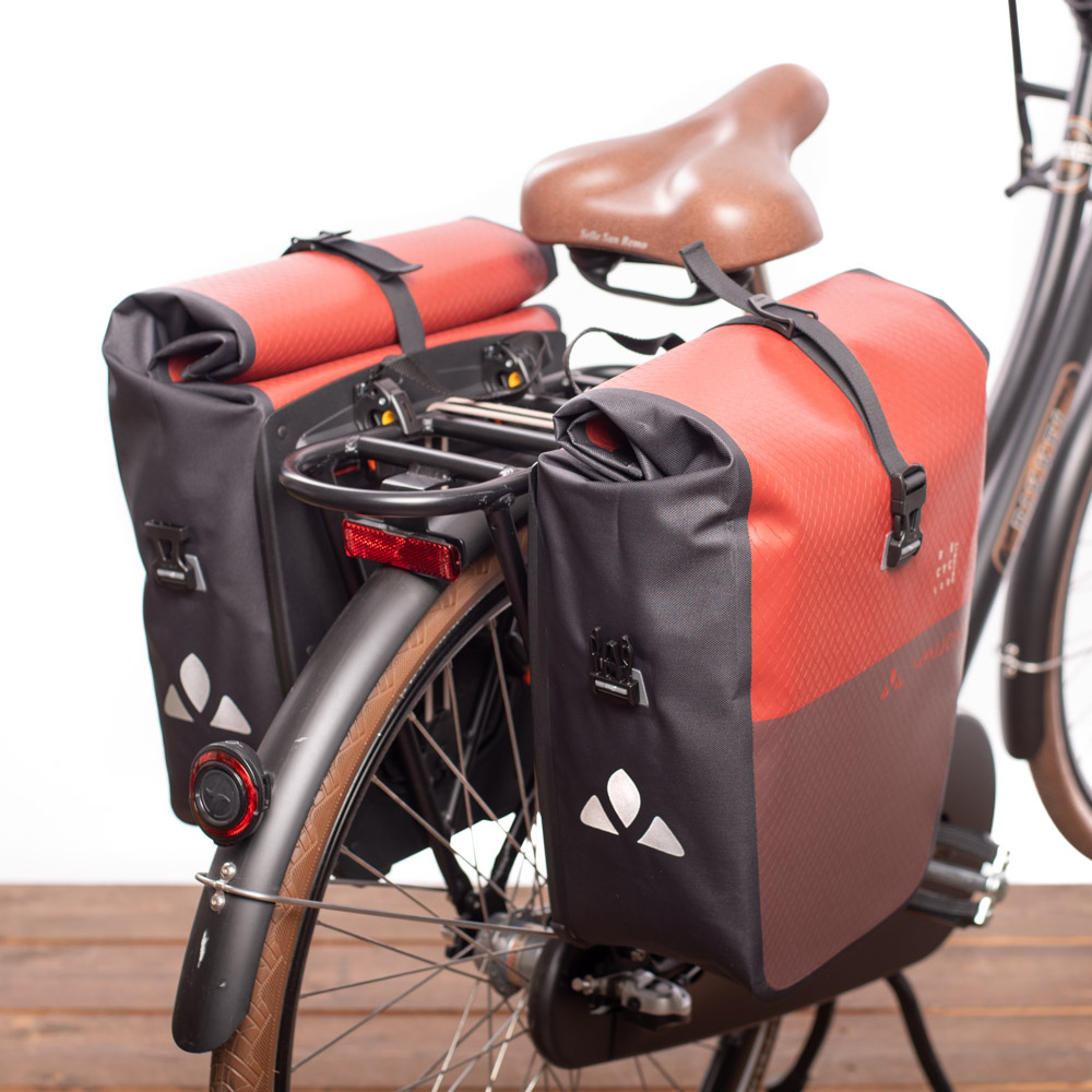 De kleuren vallen direct op bij deze dubbele tassenset voor achterop de fiets, van Vaude. Wat ook direct in het oog springt, is de sublieme kwaliteit van deze twee losse, bij elkaar horende enkele fietstassen. De tassen zijn door de waterdichte rolsluiting (zowel naar boven als naar onder afsluitbaar) in grootte verstelbaar.