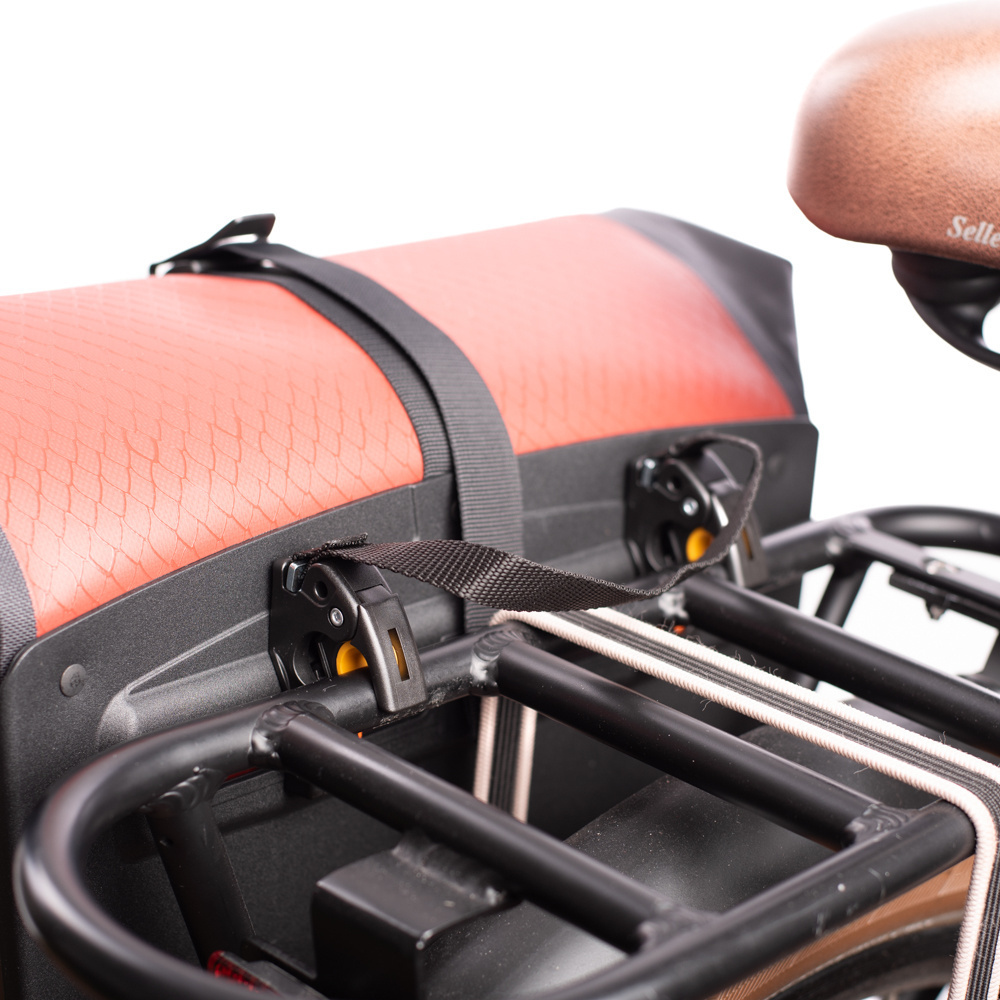 De haken van het bevestigingssysteem zijn in de breedte te verschuiven via twee railtjes in combinatie met makkelijk te bedienen handwieltjes. De haken passen standaard op dragerbuizen van 16 millimeter. U ontvangt echter adaptertjes om de tas ook geschikt te maken voor buizen van 8 en 13 mm. Het bevestigingssysteem van de fietstas bevindt zich op de harde kunststof achterplaat ("Hard Back 2.0 Eco"). Iets lager zit nóg een 360 graden te draaien haak, voor aanvullende stabiliteit aan de fiets. De onderste randen van de achterplaat zijn voorzien van antislipvoetjes.