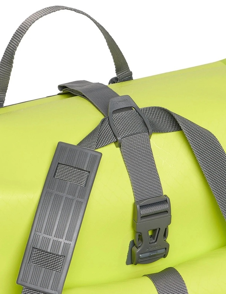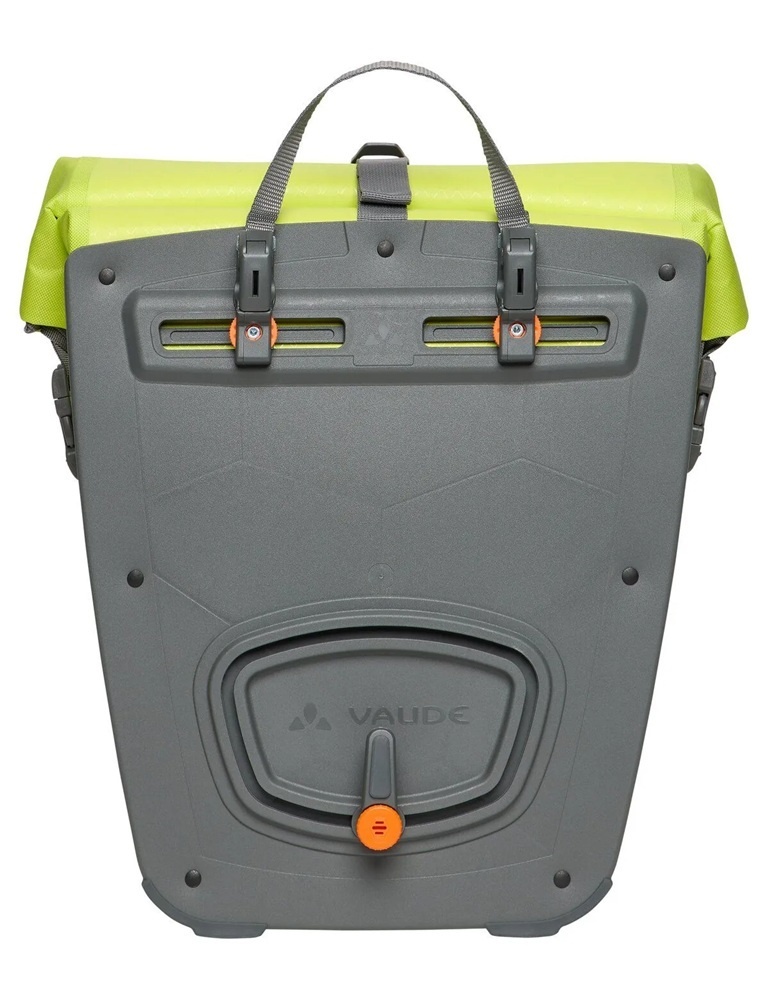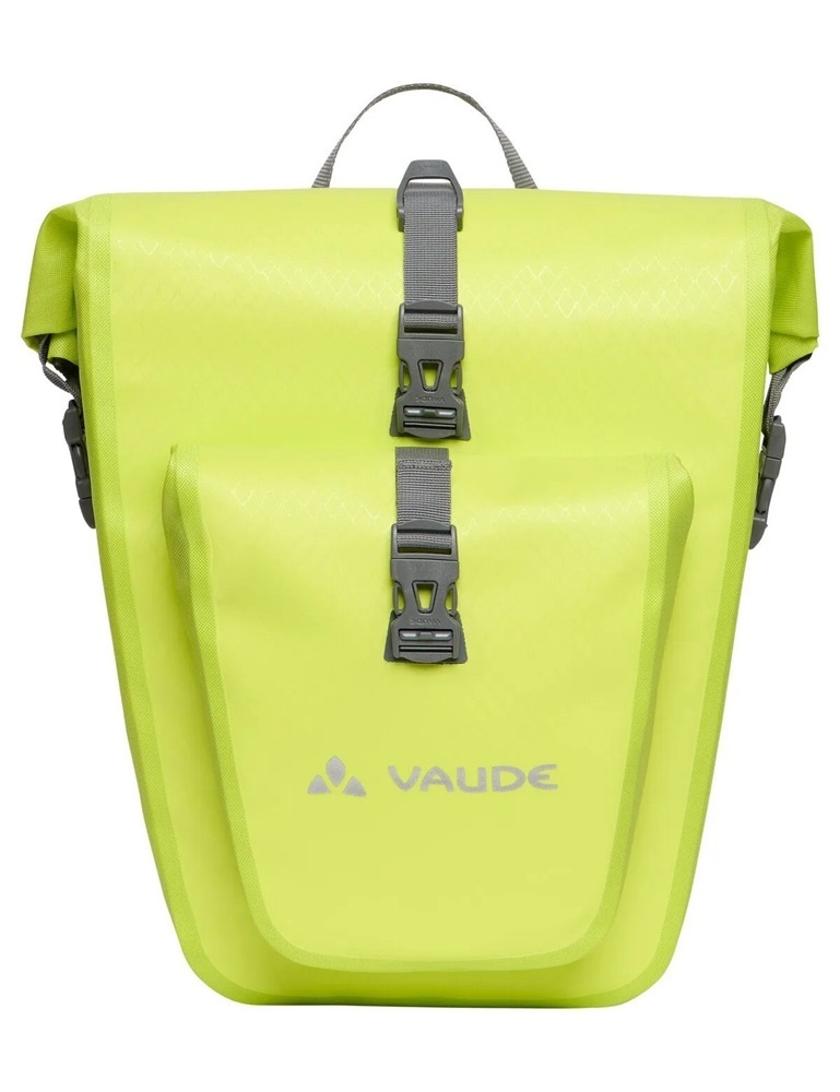 Een opvallende tassenset voor achterop de fiets, van Vaude, uitgevoerd in fluorescerend geel/groen met grijze details. Wat opvalt is de sublieme kwaliteit van deze set van twee losse enkele fietstassen. De tassen zijn door de waterdichte wikkelsluiting (zowel naar boven als naar onder afsluitbaar) in grootte verstelbaar en beide voorzien van reflectie.