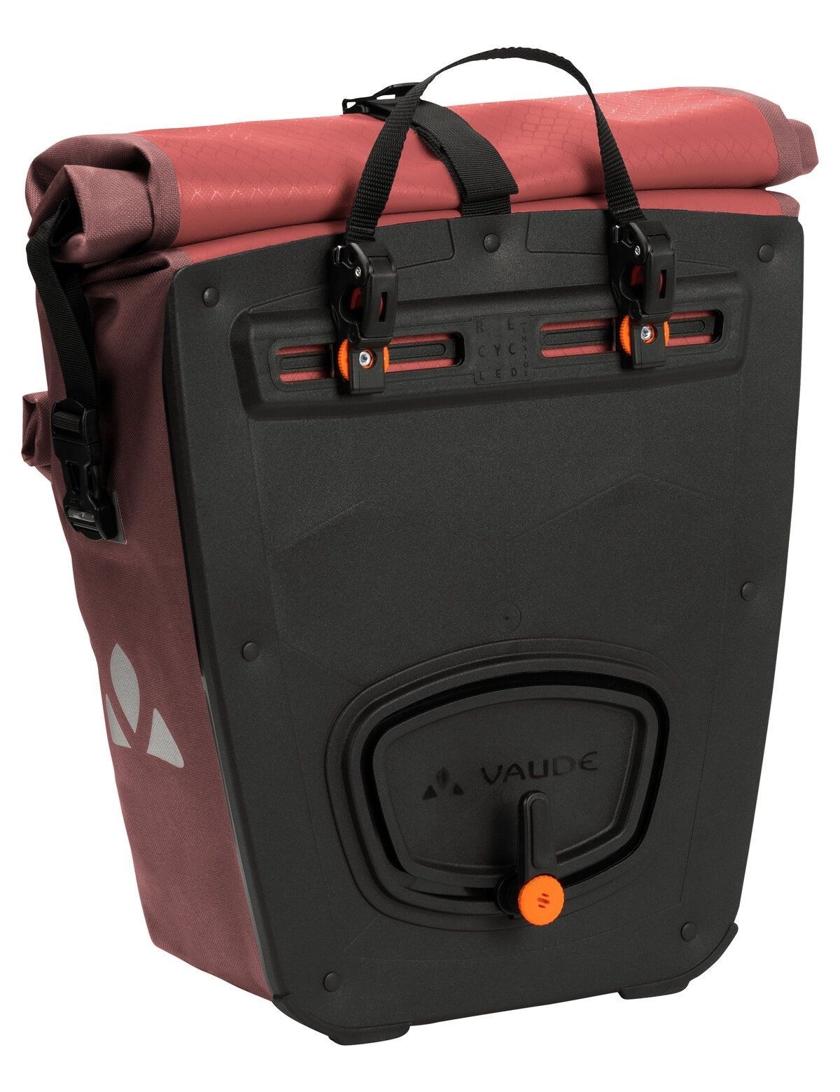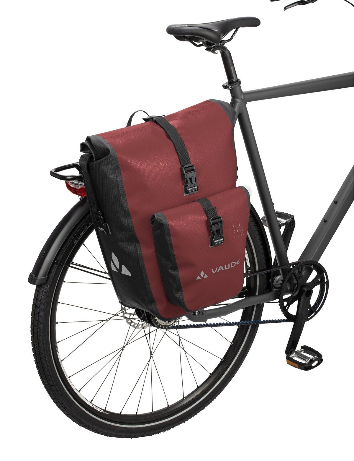 Een dubbele tassenset voor achterop de fiets, van Vaude, van gerecycled materiaal. Wat opvalt is de hoge kwaliteit van deze twee losse, bij elkaar horende, enkele fietstassen. De tassen zijn door de waterdichte wikkelsluiting (zowel naar boven als naar onder afsluitbaar) in grootte verstelbaar en voorzien van reflectie.
