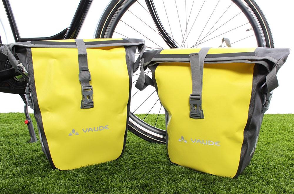 Met deze fraaie set voorwieltassen van Vaude heeft u een echte topper te pakken! De set bestaat uit twee losse tassen die gemaakt zijn van PVC-vrij canvasmateriaal. De tassen zijn waterdicht gelast en dankzij de rolsluiting in grootte verstelbaar. Naast het ruime hoofdvak zijn er twee aparte binnenvakken aanwezig, waarvan één met rits. Praktisch om uw kleinere, waardevolle spullen in op te bergen. Met deze kanariegele versie komt u mooi voor de dag!