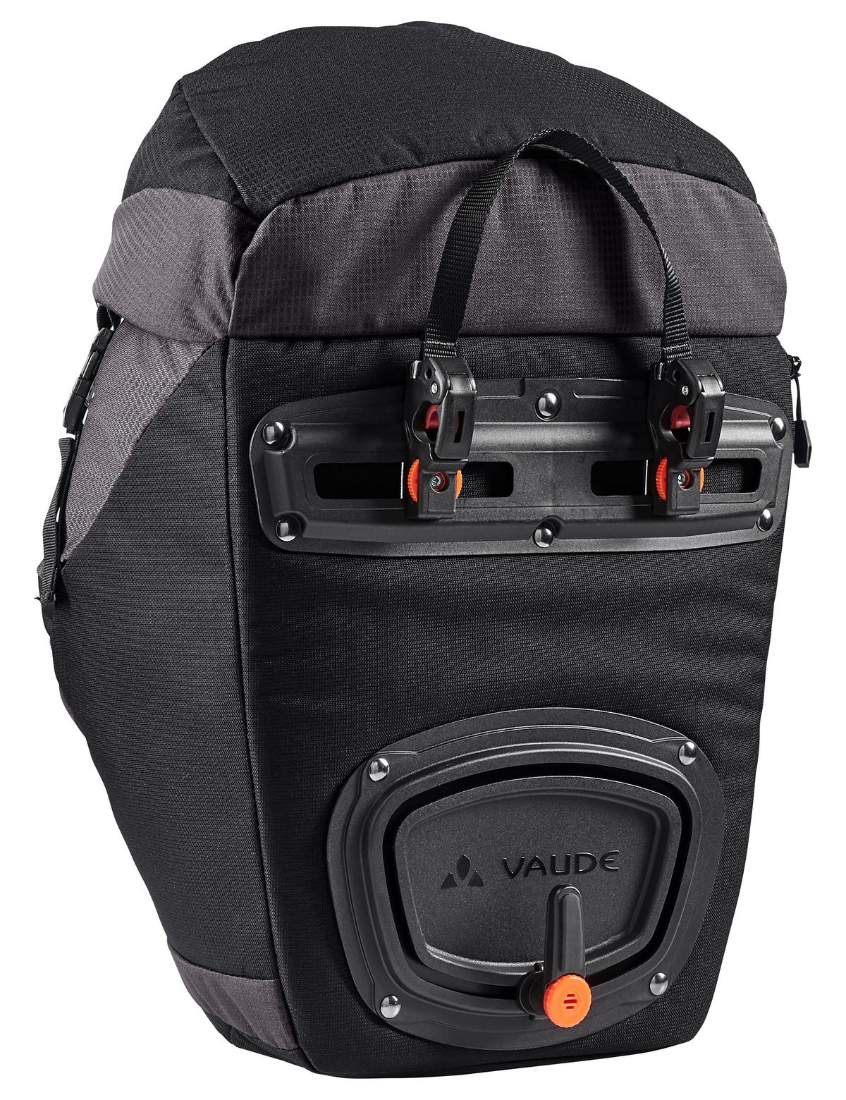 De unieke functie van Vaude die ervoor zorgt dat het afnemen van de tas letterlijk in één beweging gebeurt, heet zoals gezegd Quick Mount Release (QMR). Even trekken aan het handvatkoord dat gekoppeld is aan het kliksysteem, en de beide haken klikken soepel los van de bagagedragerbuis. Deze haken zijn in de breedte te verschuiven via twee railtjes in combinatie met makkelijk te bedienen handwieltjes. De haken passen standaard op dragerbuizen van 16 millimeter. U ontvangt echter adaptertjes om de tas ook geschikt te maken voor buizen van 8,5, 10,5 en/of 13 mm. Het geheel bevindt zich aan de beide zijden op een zachte achterplaat. Daarop zit iets lager nóg een zeer flexibel te verstellen haak, voor aanvullende stabiliteit aan de fiets.