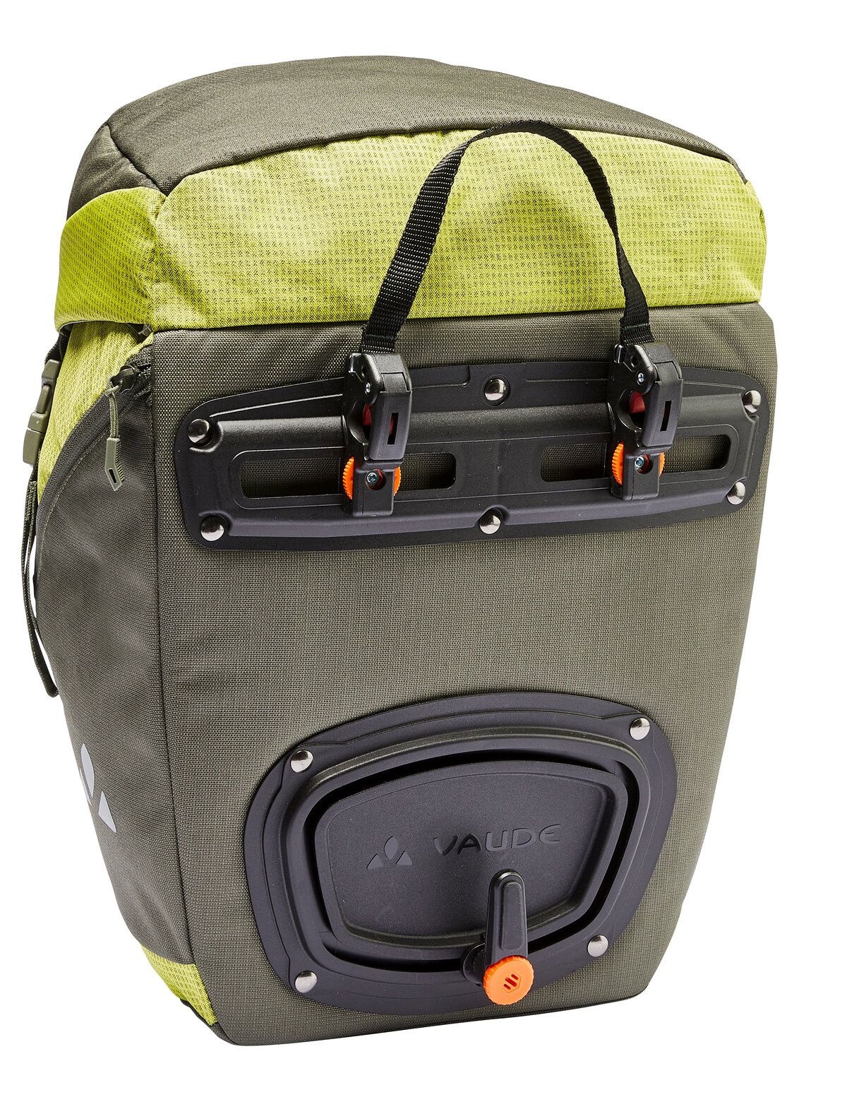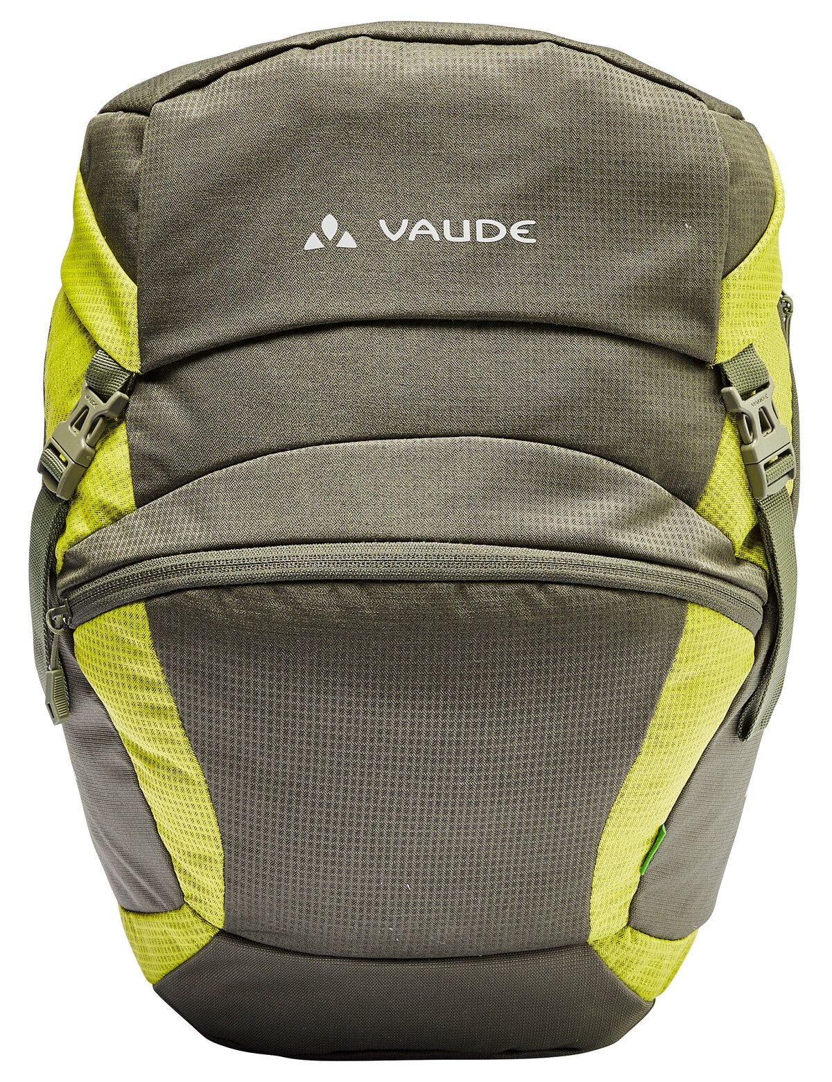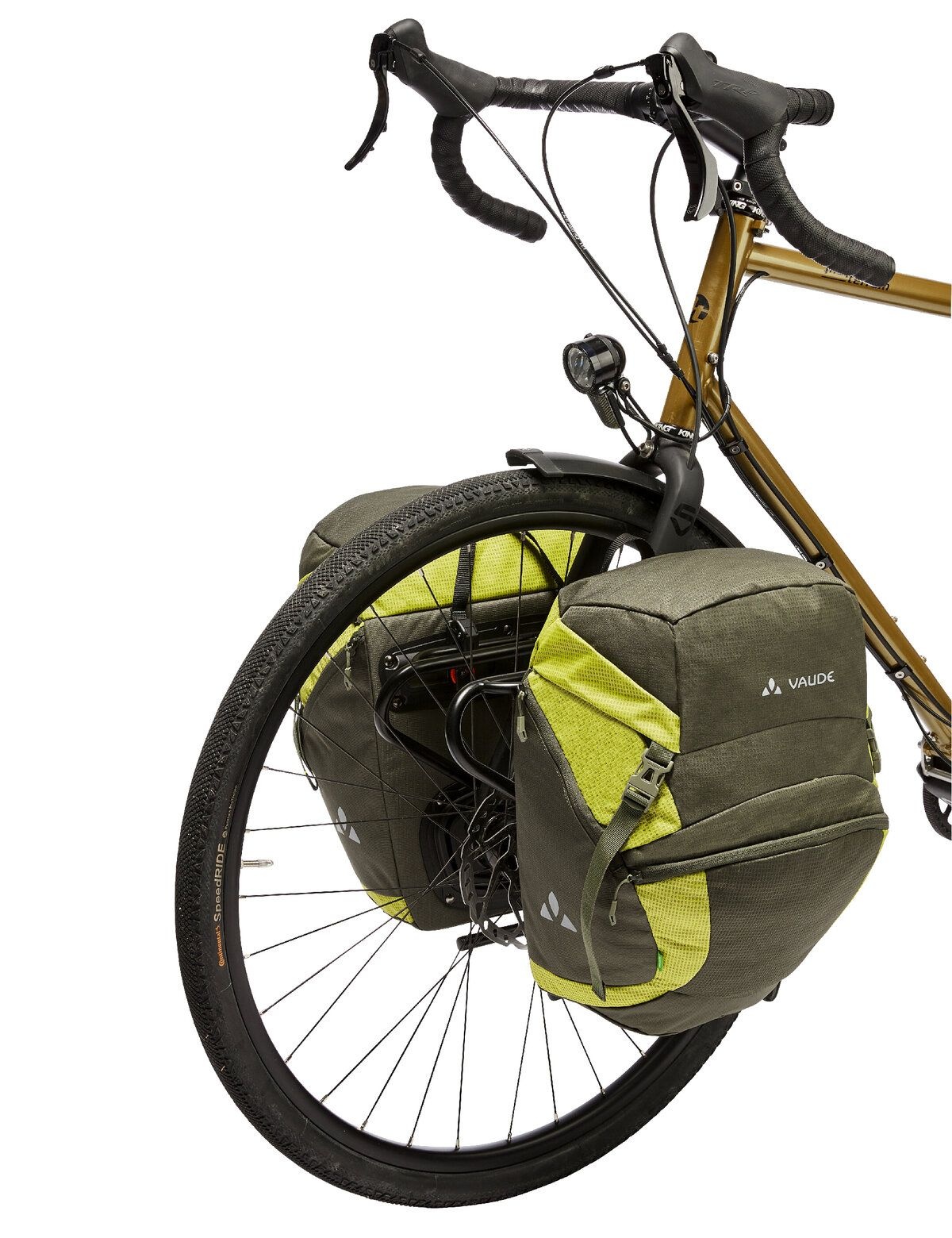 Een groene tassenset van het merk Vaude voor vóórop de fiets, slijtvast en solide, met in totaal 32 liter aan opbergruimte (tweemaal 16 liter inhoud). Ideale tassen voor lange toertochten of een fietsvakantie!
