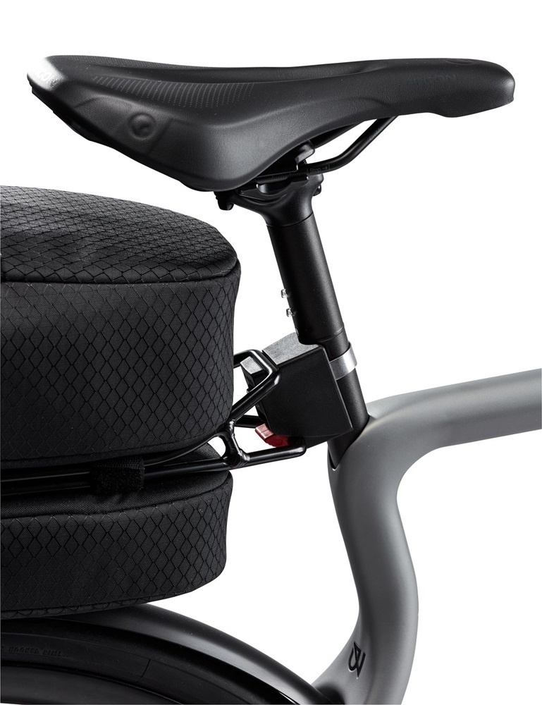 Met de meegeleverde KLICKfix Contour-adapter bevestigt u de zadeltas stevig aan de zadelpen van uw fiets. Een druk op de rode knop is voldoende om de tas weer los te krijgen. De KLICKfix-klemmen zijn geschikt voor zadelpennen met een diameter van 25-32 mm en 32-36 mm. Let op: gebruik op carbon of andere lichtgewicht zadelpennen wordt afgeraden.