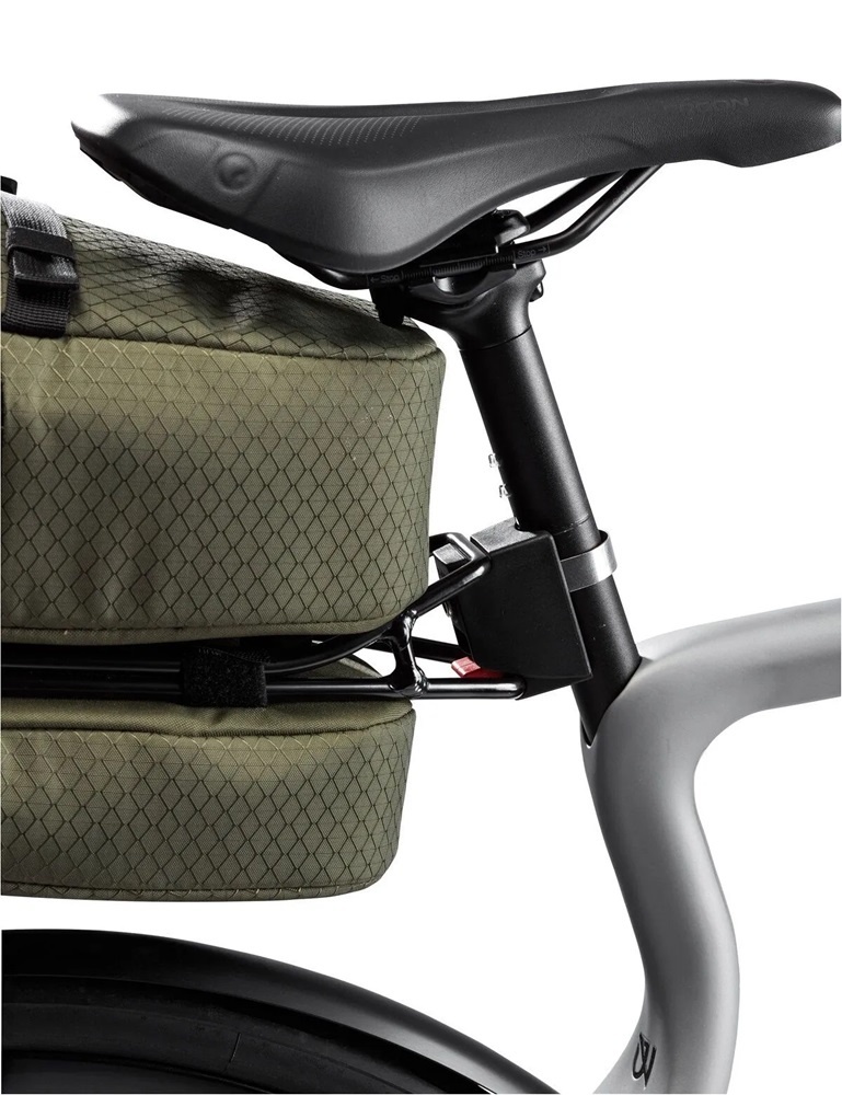 Met de meegeleverde KLICKfix Contour-adapter bevestigt u de zadeltas stevig aan de zadelpen van uw fiets. Een druk op de rode knop is voldoende om de tas weer los te krijgen. De KLICKfix-klemmen zijn geschikt voor zadelpennen met een diameter van 25-32 mm en 32-36 mm. Let op: gebruik op carbon of andere lichtgewicht zadelpennen wordt afgeraden.