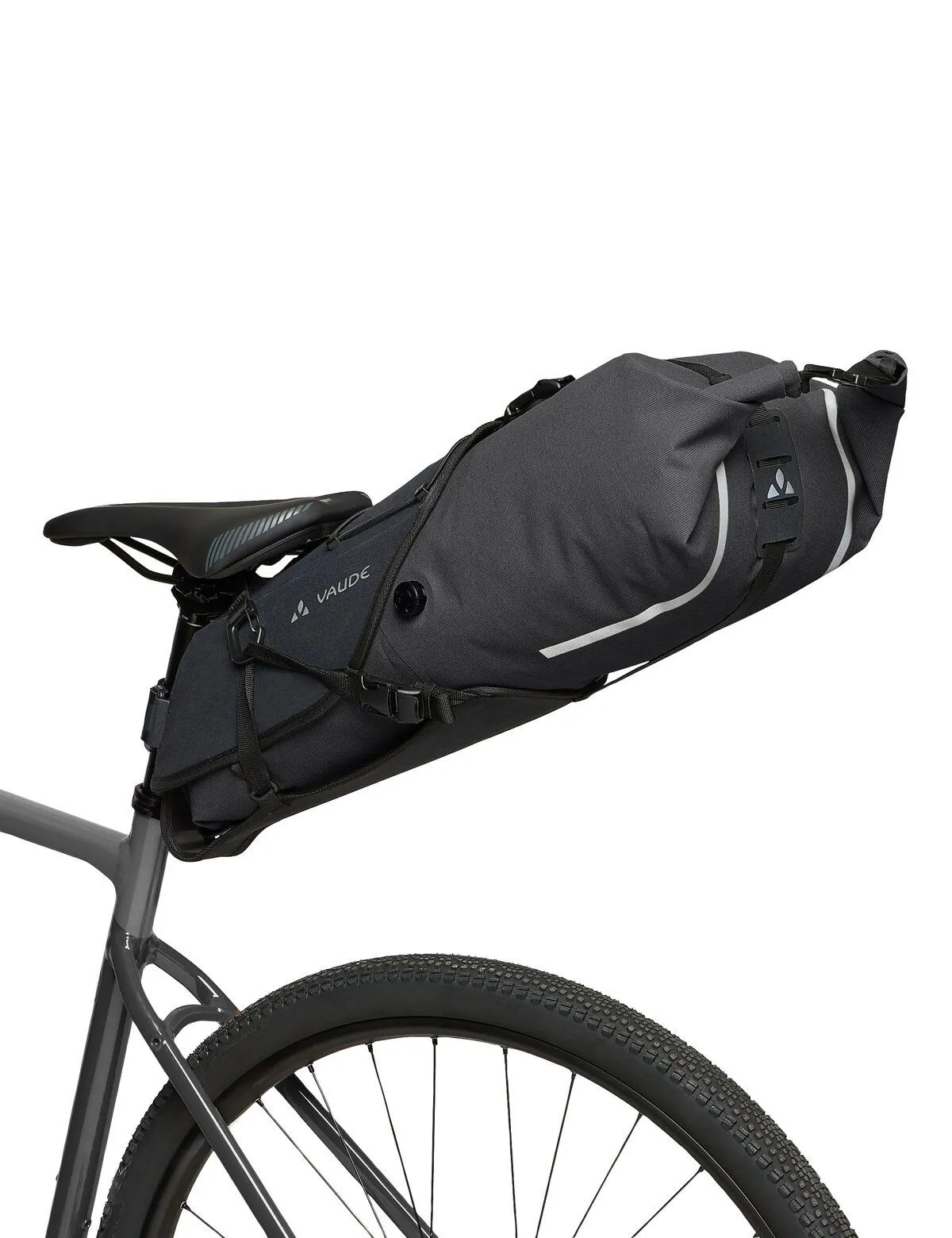U bevestigt de robuuste houder van de Trailsaddle Cage eenvoudig onder het zadel. Deze houder kan op de fiets blijven zitten tijdens het bikepacken. De uitneembare packsack heeft een waterproof rolsluiting met klikgesp en is daardoor in volume verstelbaar. Dankzij het ontluchtingsventiel kan de inhoud van de tas optimaal worden samengedrukt. De uitneembare zak zet u vast in de houder met de verstelbare banden met klikgespen. Achter de elastische koordspin op de houder kan bijvoorbeeld een regenjack worden opgeborgen. En aan de lussen op de packsack kan een lichtje worden bevestigd.