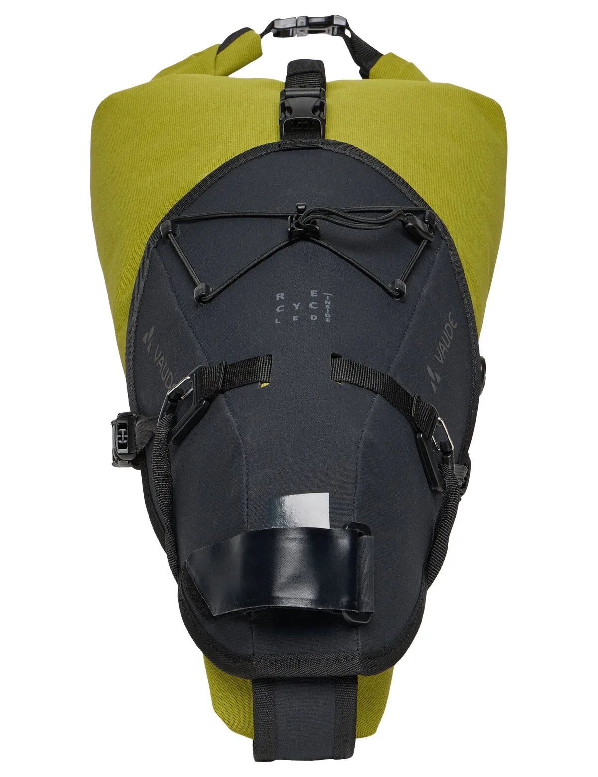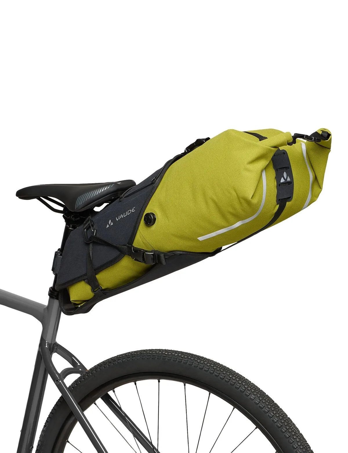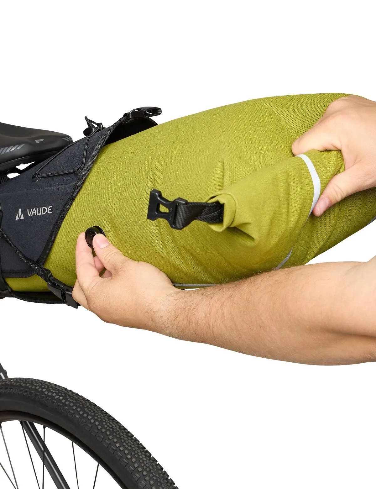 U bevestigt de robuuste zwarte houder van de Trailsaddle Cage eenvoudig onder het zadel. Deze houder kan op de fiets blijven zitten tijdens het bikepacken. De uitneembare groene packsack heeft een waterproof rolsluiting met klikgesp en is daardoor in volume verstelbaar. Dankzij het ontluchtingsventiel kan de inhoud van de tas optimaal worden samengedrukt. De uitneembare zak zet u vast in de houder met de verstelbare banden met klikgespen. Achter de elastische koordspin op de houder kan bijvoorbeeld een regenjack worden opgeborgen. En aan de lussen op de packsack kan een lichtje worden bevestigd.