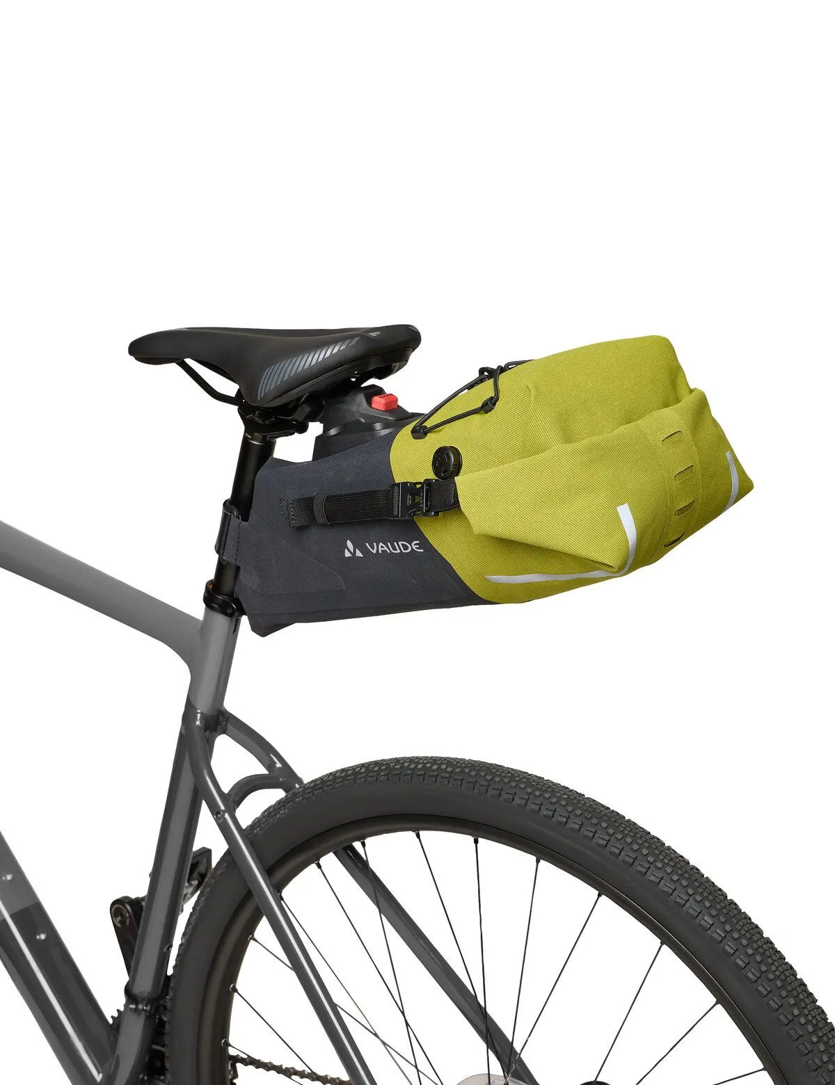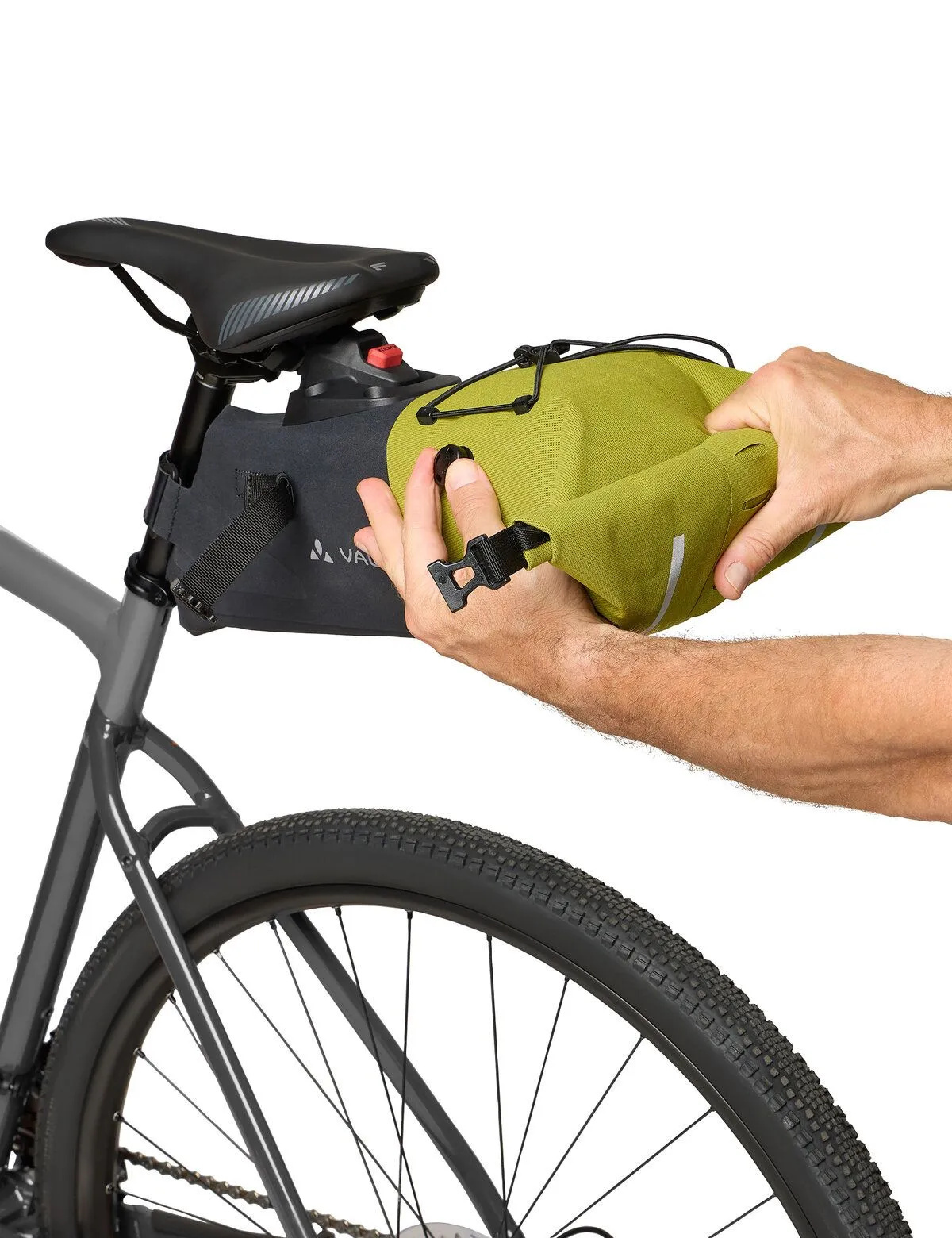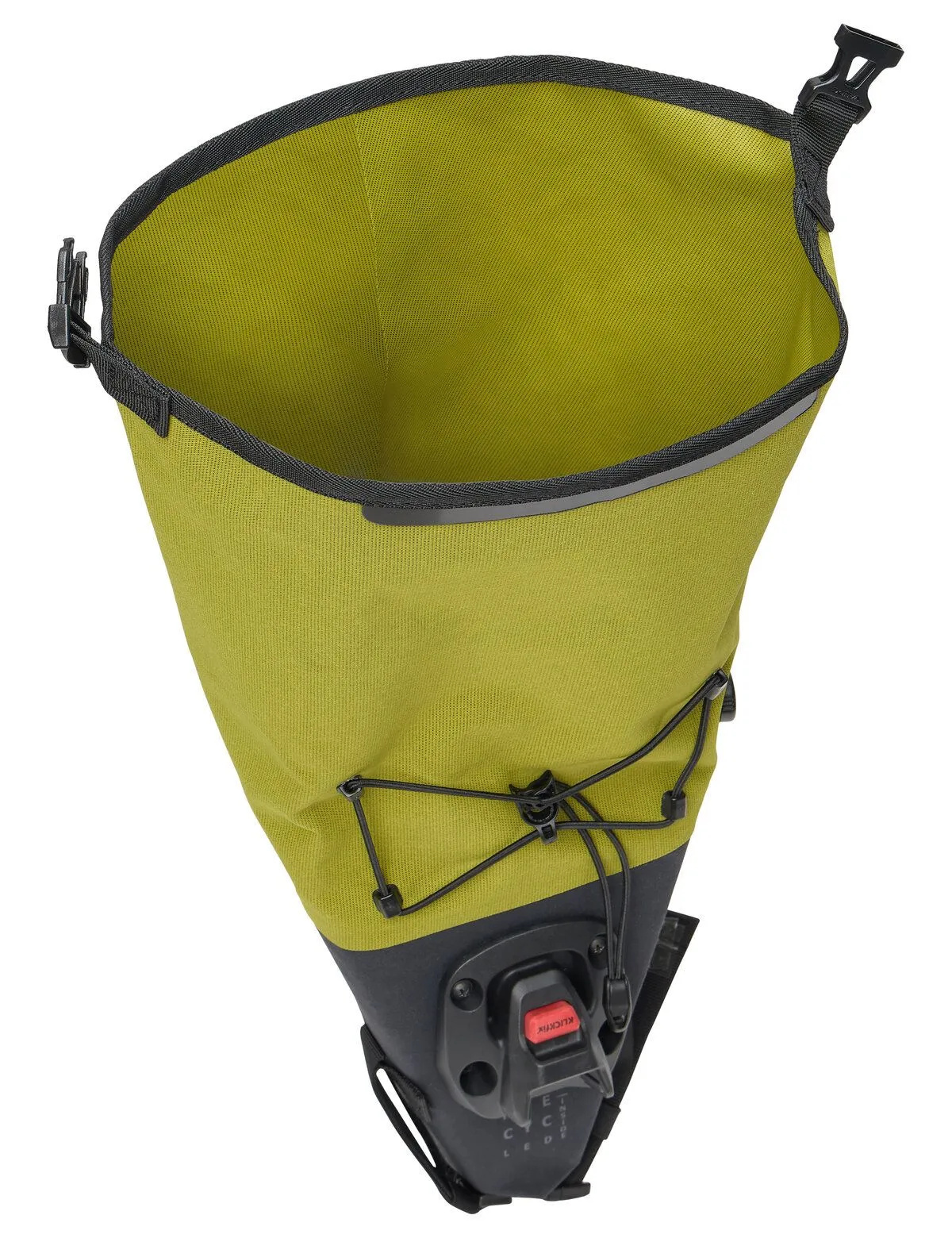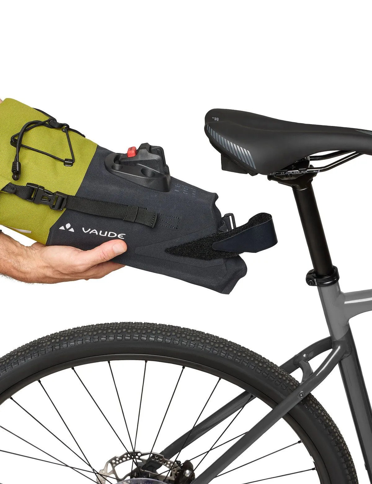 De meegeleverde beugel van het KLICKfix Contour-bevestigingssysteem wordt onder het zadel van de fiets of mountainbike gemonteerd. Dit zorgt voor een snelle bevestiging en eenvoudige verwijdering via de Contour-adapter op de zadeltas met slechts één klik. Een druk op de rode knop is voldoende om de tas weer los te krijgen. Een strook stevig klittenband bevestigt de zadeltas bovendien aan de zadelbuis. De zadeltas heeft een grote afstand tot het achterwiel en een instelbare hellingshoek.