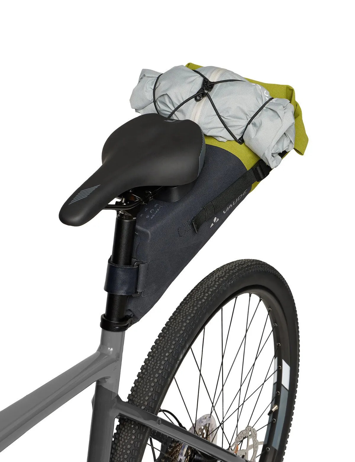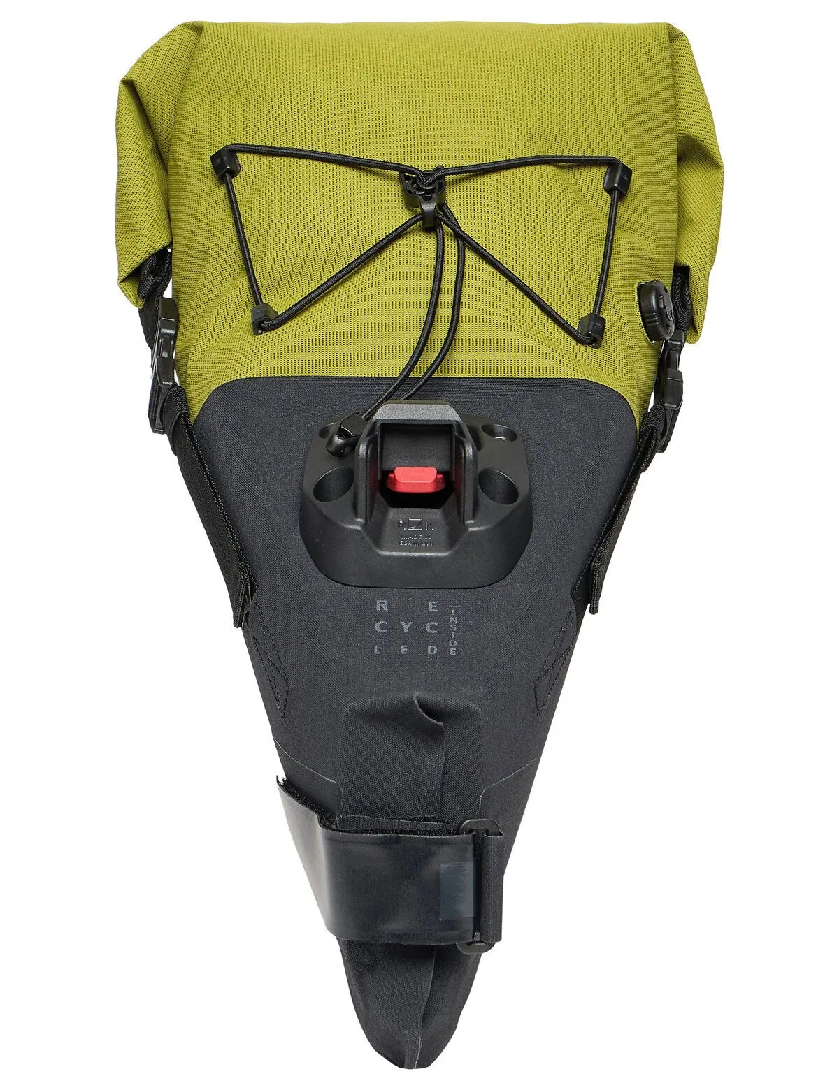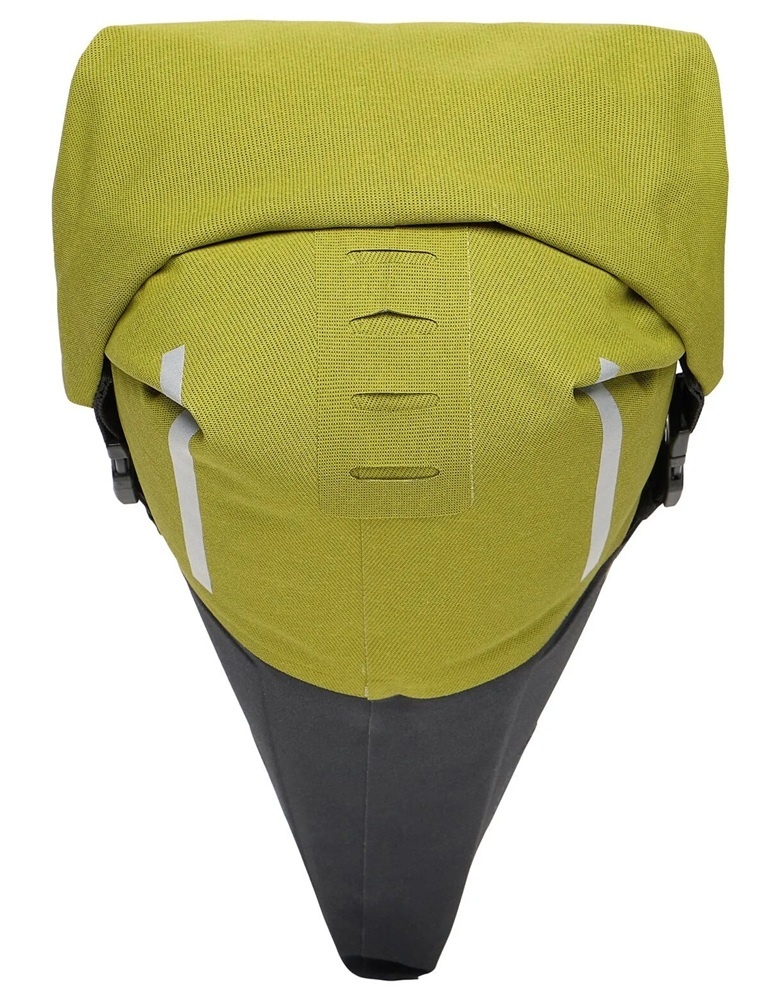 De Trailsaddle Compact M bestaat uit een stevige onderste helft en een flexibelere bovenste helft. Zo kunt u de tas gemakkelijker inpakken. De tas sluit met een waterdichte rolsluiting die wordt vastgezet met twee klikgespen aan de zijkanten van de tas. Het ontluchtingsventiel zorgt voor een goede compressie van de inhoud. Een stabilisatieband aan de bovenkant drukt de inhoud samen en zet deze na het oprollen extra vast met een flexibele haakgesp in een singelstrip. Hieraan kan ook een lichtje worden bevestigd. Bovenop de zadeltas zit een handige elastische koordspin, waaronder bijvoorbeeld een regen- of windjack opgeborgen kan worden.