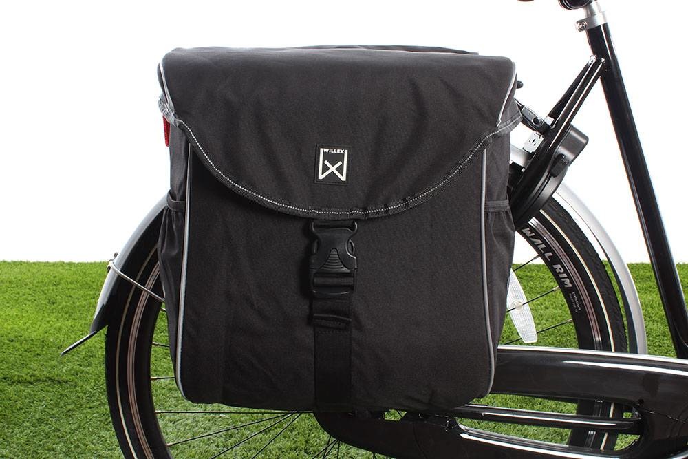 De praktische en dubbele fietstas 'Bagagetas 300' in de kleur zwart is van degelijke kwaliteit. Deze Willex tas heeft een maximale inhoud van 38 liter en biedt volop ruimte in de eenvoudige hoofdvakken. De set is voorzien van zilveren details en zijvakken, waar u bijvoorbeeld een flesje water in kwijt kunt.