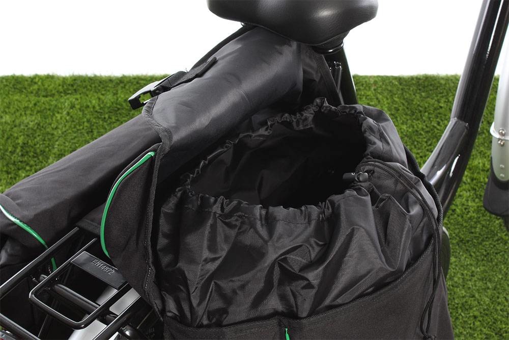 U bevestigt de dubbele fietstas eenvoudig aan uw bagagedrager met de twee bevestigingsriempjes. De tas is dus ook snel weer van de fiets af te halen. De bovenkant (tussen de tassen) bestaat uit twee banden, waardoor de snelbinders toegankelijk blijven. Handig voor bijvoorbeeld het plaatsen van ledverlichting.