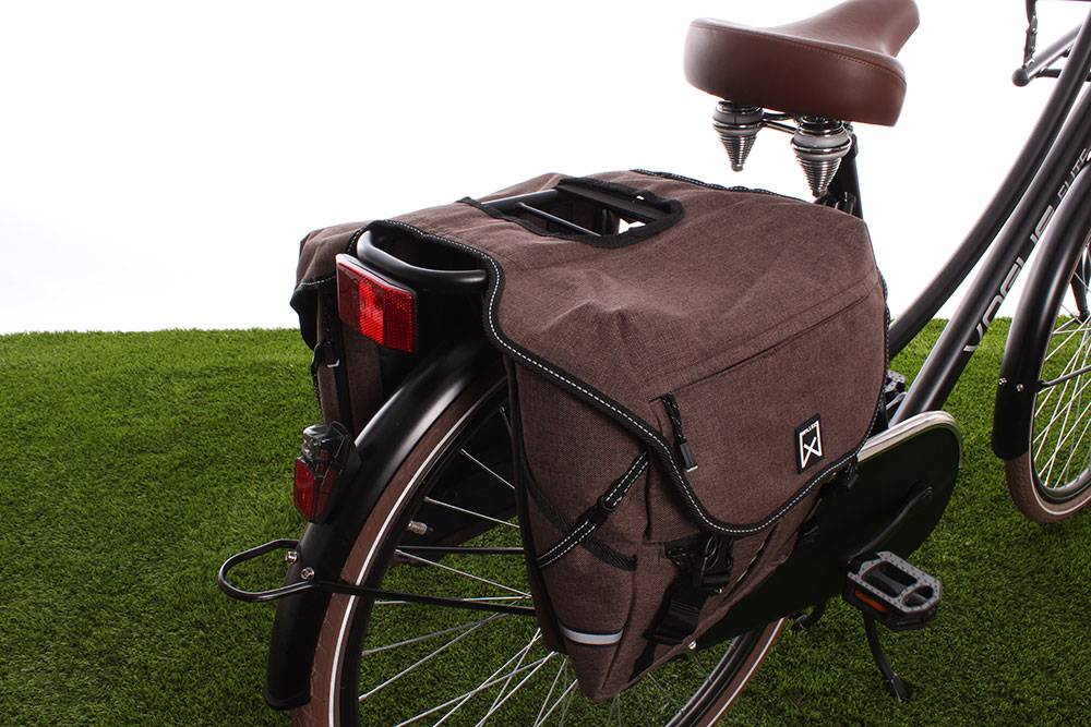 Deze veelzijdige dubbele fietstas in de kleur bruin is compact en van goede kwaliteit. Met het gepatenteerde klemsysteem van Willex bevestigt u deze mooie fietstas zo aan uw fiets. De tas is ook verkrijgbaar in andere kleuren.