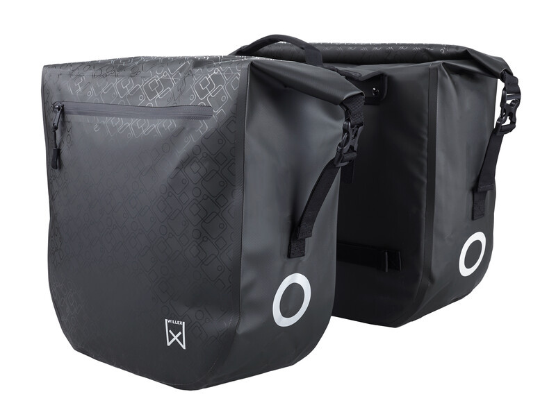 Een sportieve waterdichte fietstas van het Belgische merk Willex. De donkergroene (bijna zwart) dubbele fietstas is gemaakt van waterdicht tweezijdig gecoat bisonyl, heeft een inhoud van ruim 46 liter en wordt bevestigd met riempjes. De fietstas heeft een waterproof rolsluiting en is voorzien van een opvallende reflecterende bedrukking.