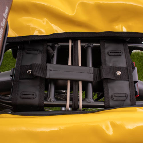 Let op: de fietstas is gemaakt van waterdicht, tweezijdig gecoat bisonyl en kan dus een regenbuitje hebben. Maar doordat de tas gestikt is, is deze bij aanhoudende regen niet 100% waterdicht.