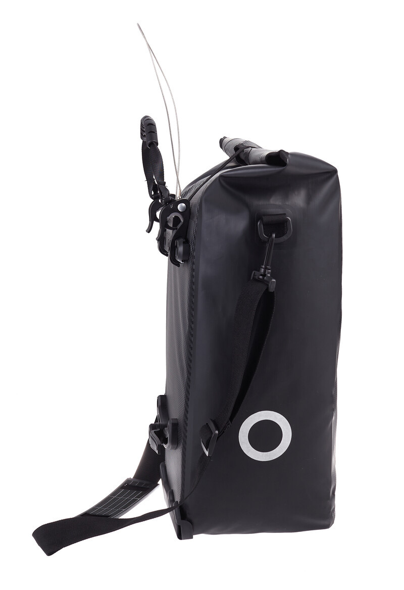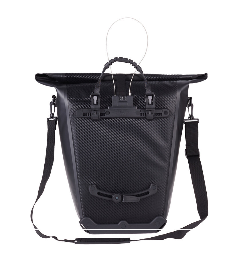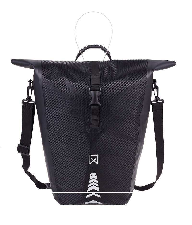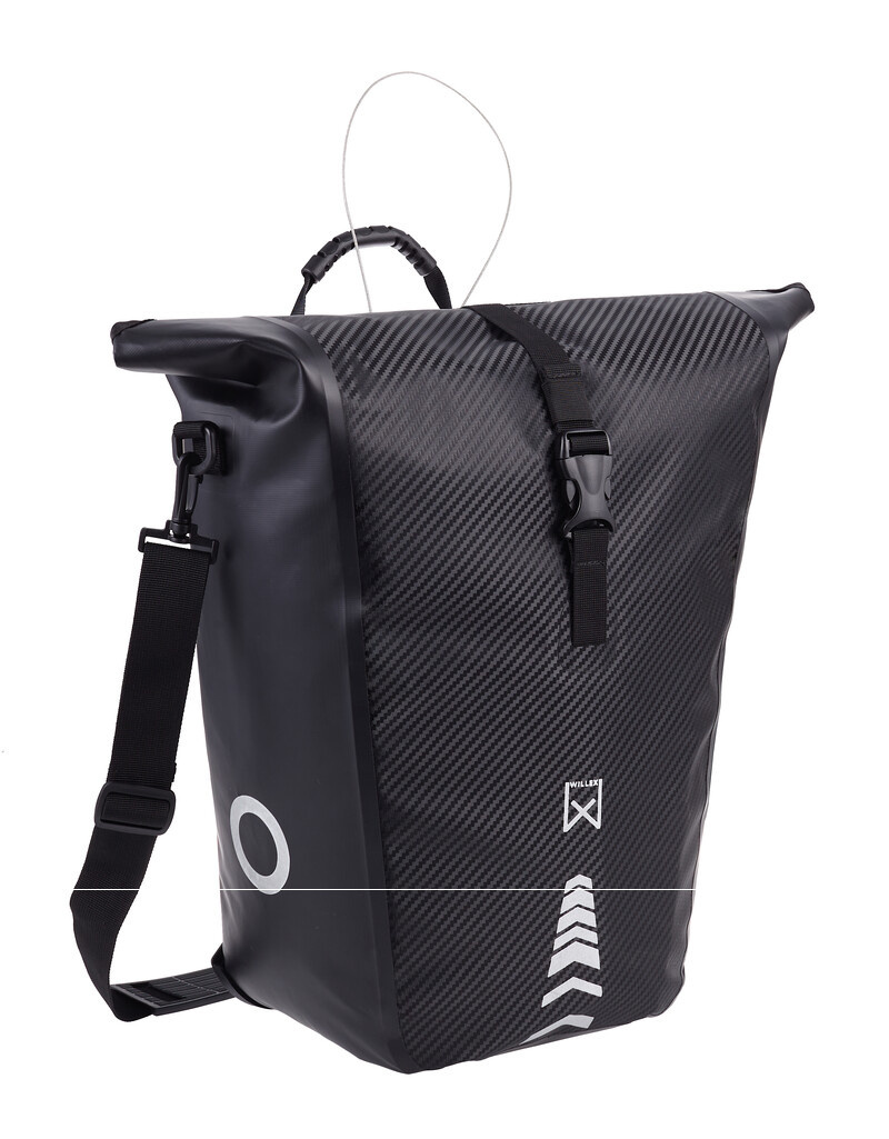 Een sportieve waterdichte fietstas van het Belgische merk Willex. De zwarte enkele fietstas met stoere carbon look is gemaakt van waterdicht tweezijdig gecoat bisonyl, heeft een inhoud van ca. 25 liter en wordt bevestigd met haken. De fietstas heeft een waterproof rolsluiting en is voorzien van een reflecterende bedrukking en een afneembare schouderriem.
