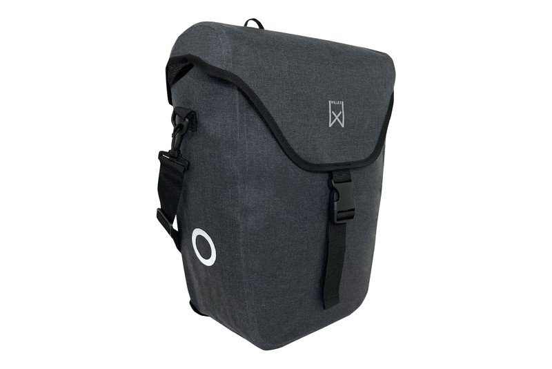 Een degelijke, waterdichte fietstas van het Belgische merk Willex. De donkergrijze enkele fietstas is gemaakt van waterdicht polyester, heeft een inhoud van 21 liter en wordt bevestigd met haken. De fietstas heeft een waterproof rolsluiting en is voorzien van reflectie en een afneembare schouderband.