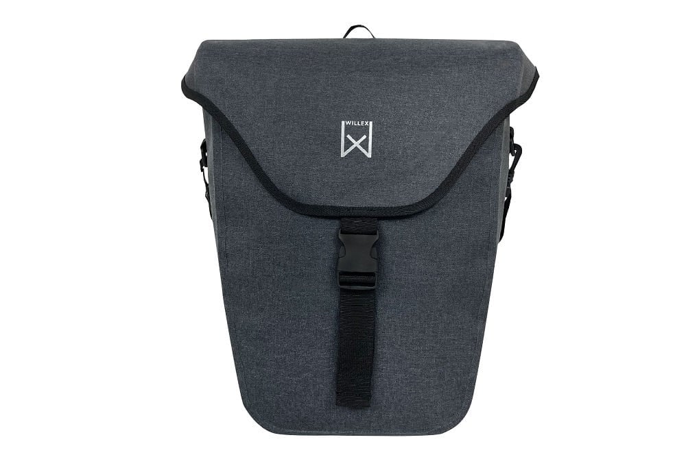 Een sportieve waterdichte fietstas van het Belgische merk Willex. De enkele fietstas is gemaakt van 100% waterdicht polyester, heeft een inhoud van 21 liter en wordt bevestigd met verstelbare haken. De fietstas heeft een waterproof rol- en kniksluiting, een afneembare schouderriem en is voorzien van reflectie.