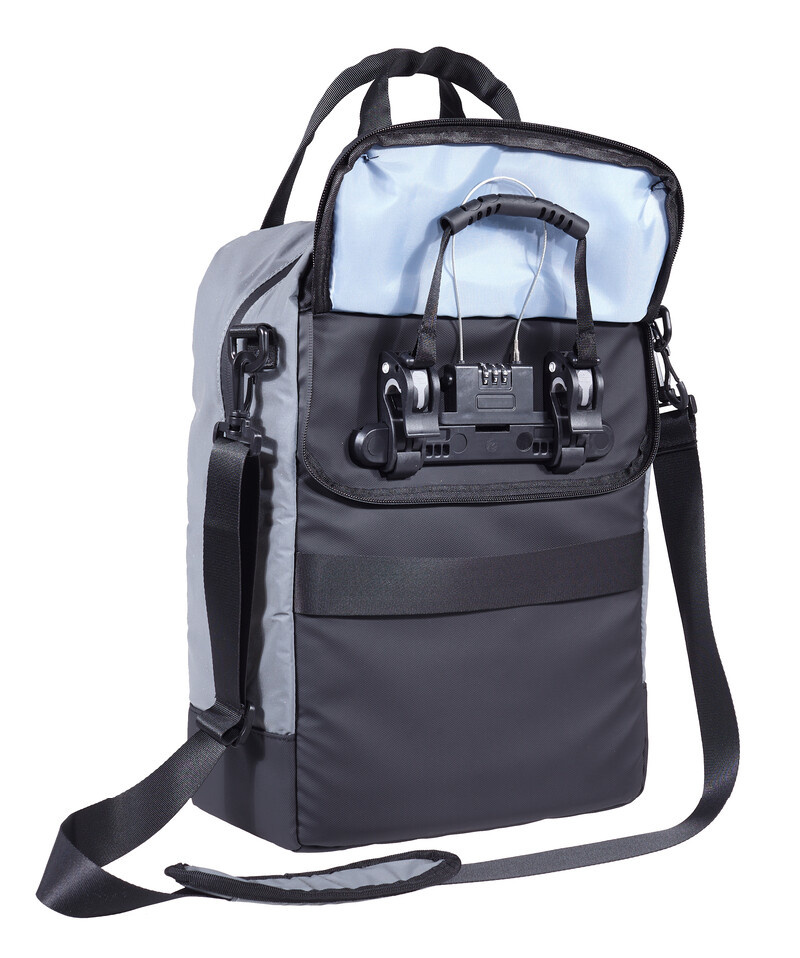 Dankzij de horizontaal verstelbare haken past de fietstas op vrijwel elke bagagedrager. Deze haken zijn voorzien van een cijferslot, om diefstal van de tas te voorkomen. Wanneer u op de bestemming bent aangekomen, draagt u de tas gemakkelijk met u mee aan de afneembare, verstelbare schouderband. De haken kunt u netjes afdekken met een flap met een rits.