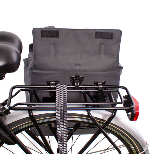 Een 'enkele fietstas' / pakaftas past op de e-bike mits er voldoende ruimte aanwezig is tussen de accu en de bagagedragerbuis.