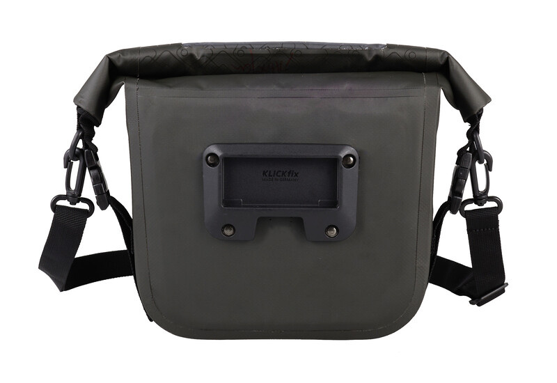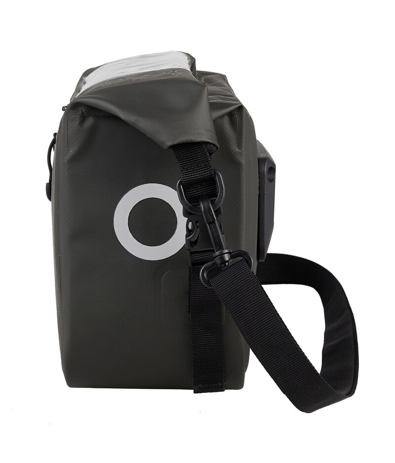 Het hoofdvak van de stuurtas sluit met een waterproof rolsluiting die u dichtmaakt met klittenband en vastzet met twee klikgespen. Op de voorkant van de tas zit een extra opbergvak met een waterproof ritssluiting, voor het opbergen van kleine spullen die u onderweg bij de hand wilt houden. Bovenop de tas zit een transparant venster voor een kaart of smartphone. De tas is rondom verstevigd en behoudt daardoor zijn vorm. Van de fiets af draagt u de tas gemakkelijk met u mee aan de afneembare en verstelbare zwarte schouderband.