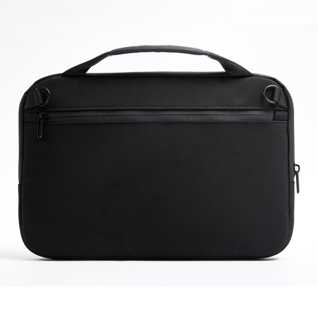 De laptoptas is gemaakt van gerecycled materiaal met een waterafstotende afwerking en voorzien van een waterdichte ritssluiting en een zachte, lichtgrijze fleecevoering. De tas heeft een extra ritsvak aan de achterkant, en wordt geleverd met een afneembare zwarte schouderriem.