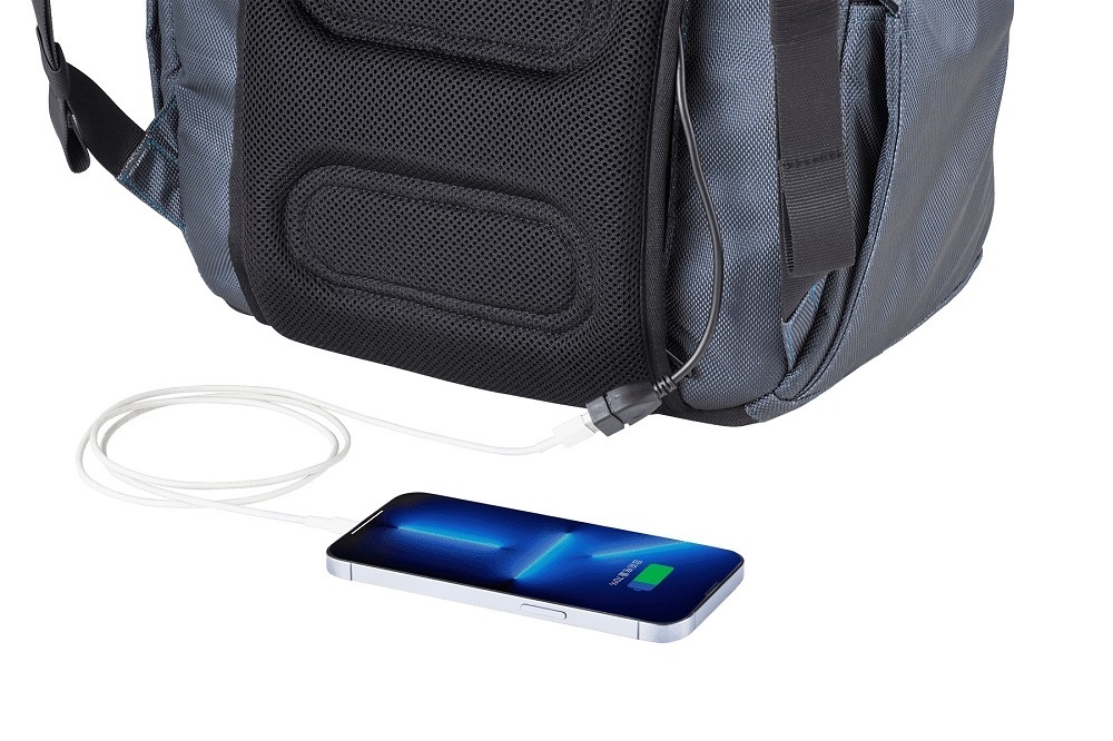 Achter het ventilerende rugpaneel van de tas zit een verborgen RFID-beschermd ritsvak met daarin een USB-oplaadpoort. Onderaan aan de achterkant van de tas vindt u achter een ritssluiting een uitbreidbaar bodemvak; ideaal voor schoenen of natte kleding.