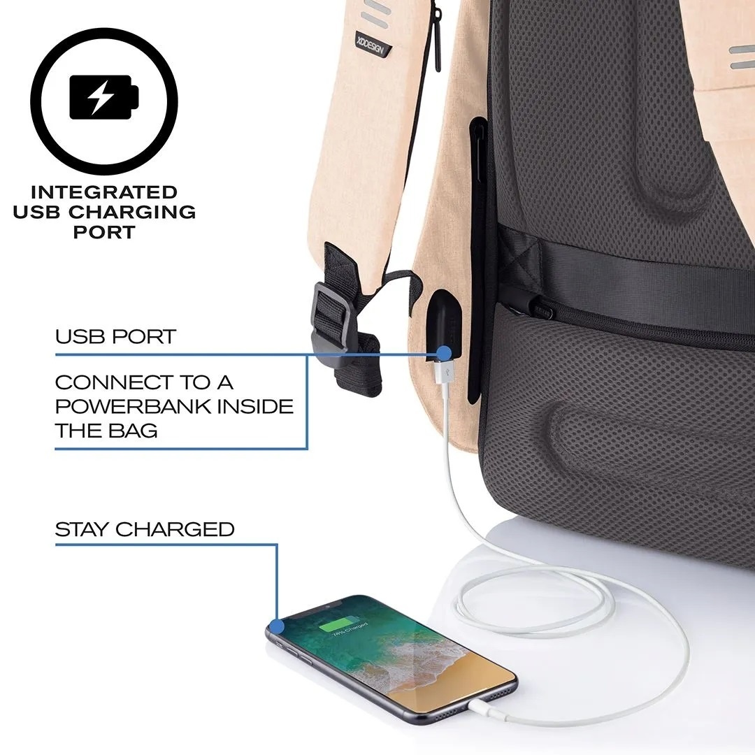 Deze rugtas heeft een geïntegreerde USB oplaadpoort, waar u een powerbank (niet inbegrepen) op kunt aansluiten. Zo is uw telefoon of tablet altijd opgeladen! Uw 12,9 inch tablet neemt u handig mee in het speciaal daarvoor ontworpen tabletvak. Ook is er ruimte voor een 13,3 inch laptop.