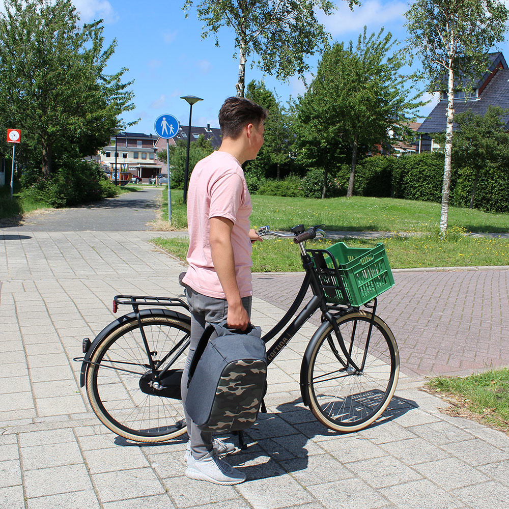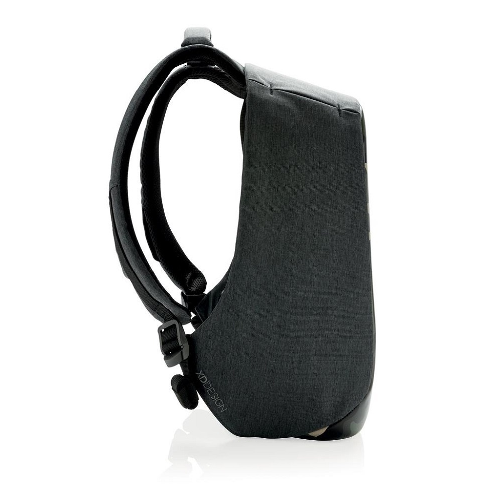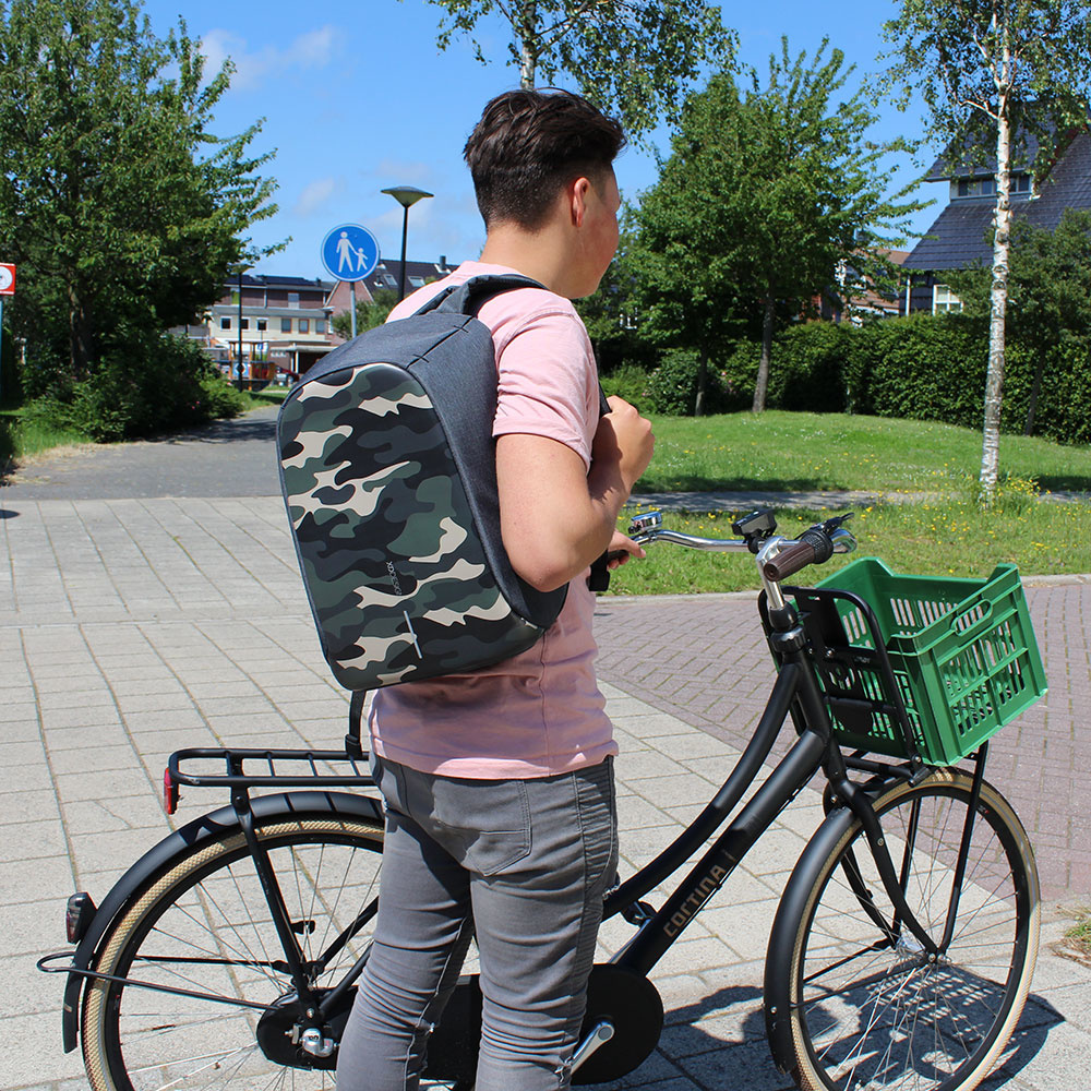 De Bobby is gemaakt van waterafstotend en shockproof materiaal, zodat uw spullen tegen een stootje kunnen. Deze grijze rugtas met camouflageprint is bovendien gemaakt van snijbestendig materiaal. Uw spullen zitten dus veilig op uw rug. Of aan een trolley. Aan de achterkant van de tas zit namelijk een bagageriem, welke u over een trolley kunt plaatsen. Zo neemt u de tas ook makkelijk mee op reis!