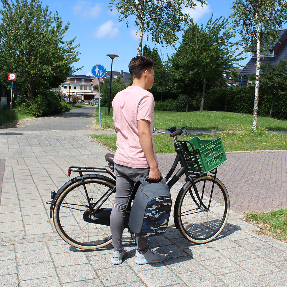 Op sommige foto's wijkt de kleur van de tas af van de werkelijk kleur. Deze Bobby Camouflage Blue is donkergrijs en heeft een voorkant met camouflage print.