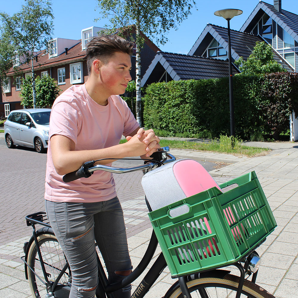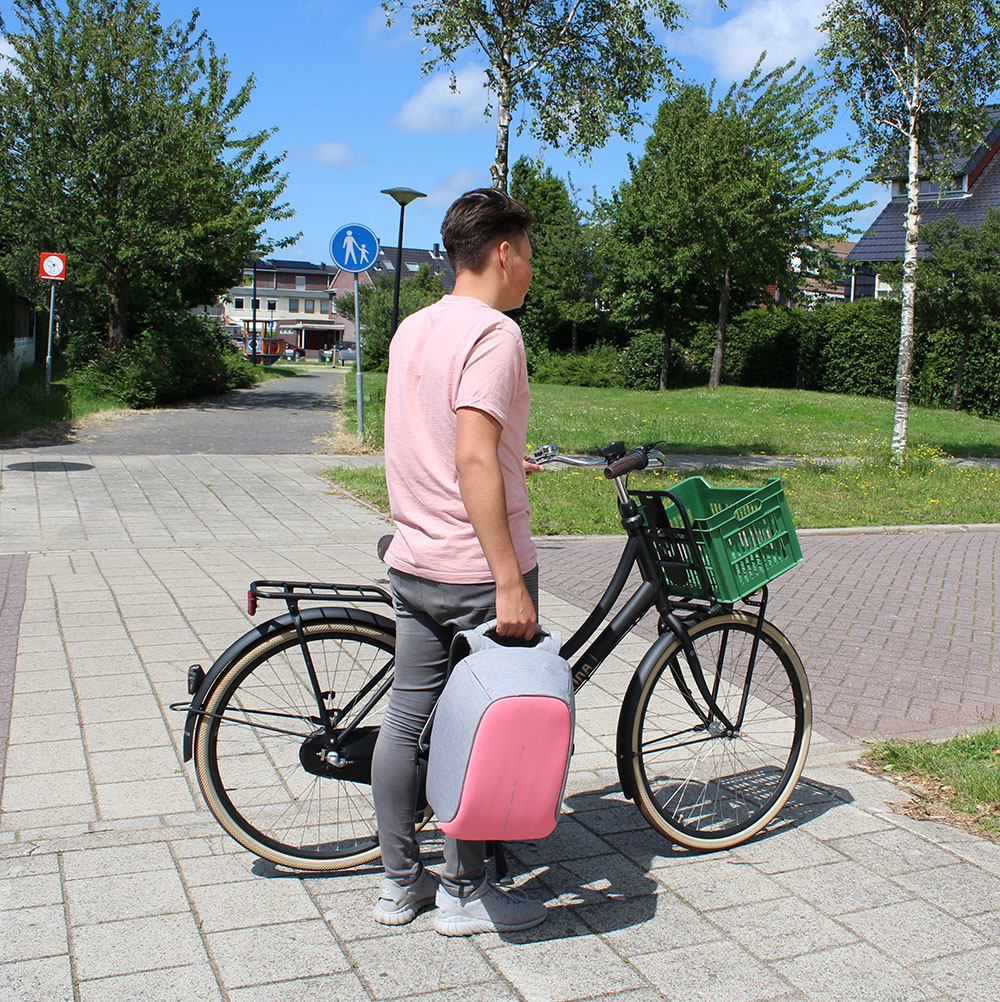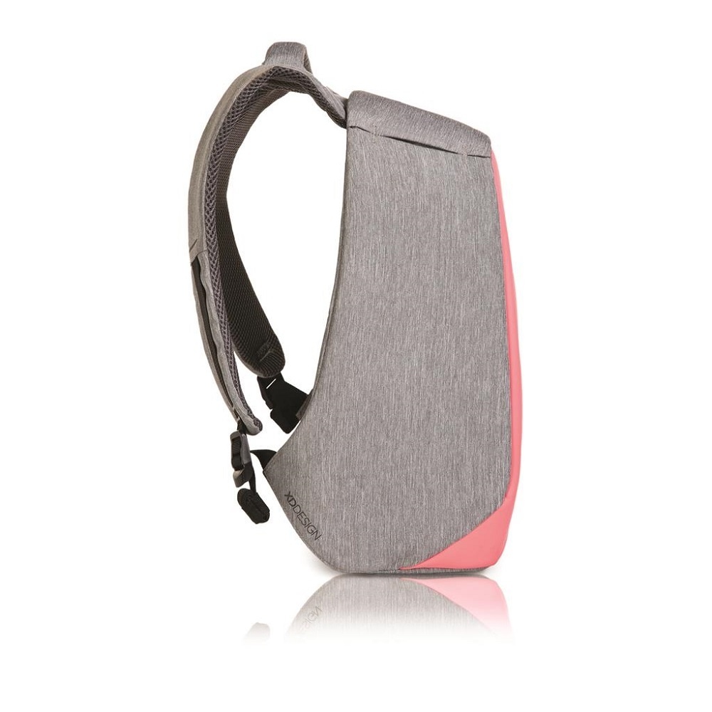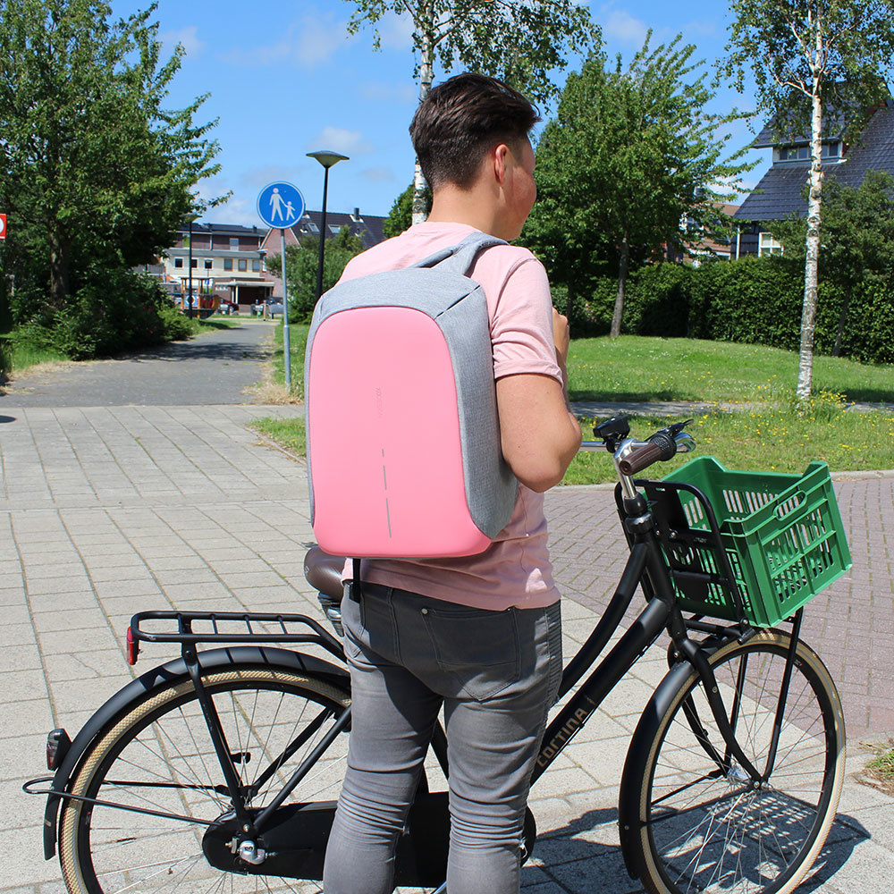 De Bobby is gemaakt van waterafstotend en shockproof materiaal, zodat uw spullen tegen een stootje kunnen. Deze grijze rugtas met roze voorkant is bovendien gemaakt van snijbestendig materiaal. Uw spullen zitten dus veilig op uw rug. Of aan een trolley. Aan de achterkant van de tas zit namelijk een bagageriem, welke u over een trolley kunt plaatsen. Zo neemt u de tas ook makkelijk mee op reis!