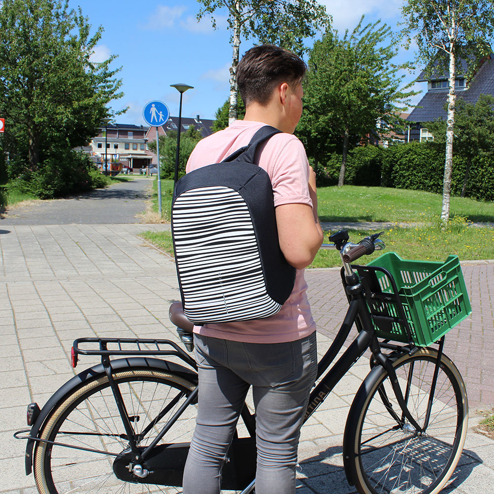 De Bobby is gemaakt van waterafstotend en shockproof materiaal, zodat uw spullen tegen een stootje kunnen. Deze zwarte rugtas met zebraprint is bovendien gemaakt van snijbestendig materiaal. Uw spullen zitten dus veilig op uw rug. Of aan een trolley. Aan de achterkant van de tas zit namelijk een bagageriem, welke u over een trolley kunt plaatsen. Zo neemt u de tas ook makkelijk mee op reis!