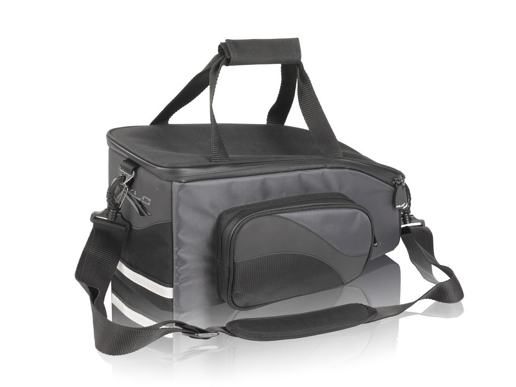 Deze zwarte bagagedragertas met zijvakken van het merk XLC is gemaakt van waterafstotend polyester. Er zijn verschillende soorten stof gebruikt, waardoor de tas een stoer en speels uiterlijk heeft. De tas is voorzien van reflectie, twee handvatten en een losse schouderband.